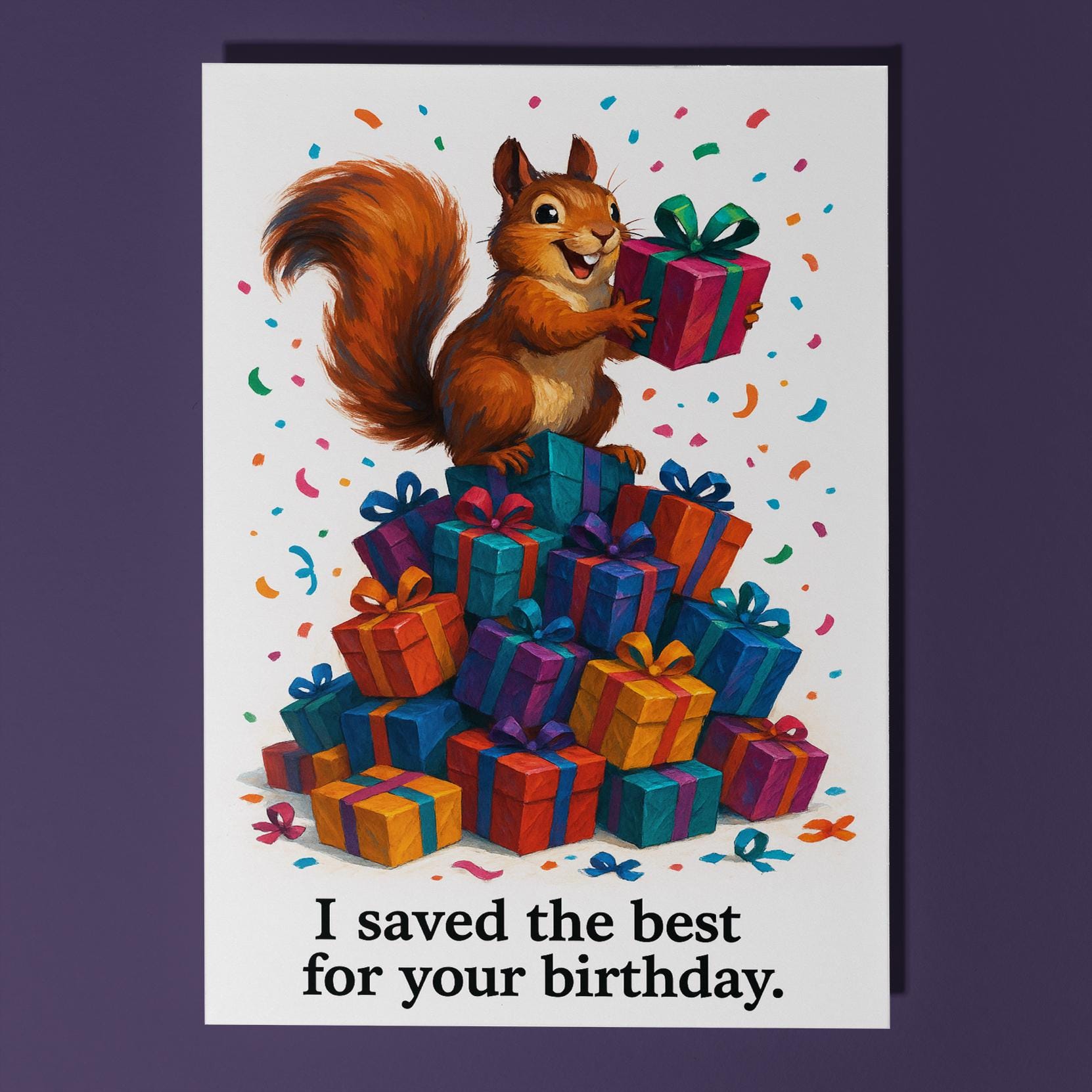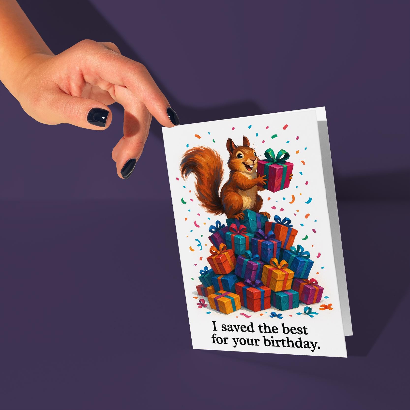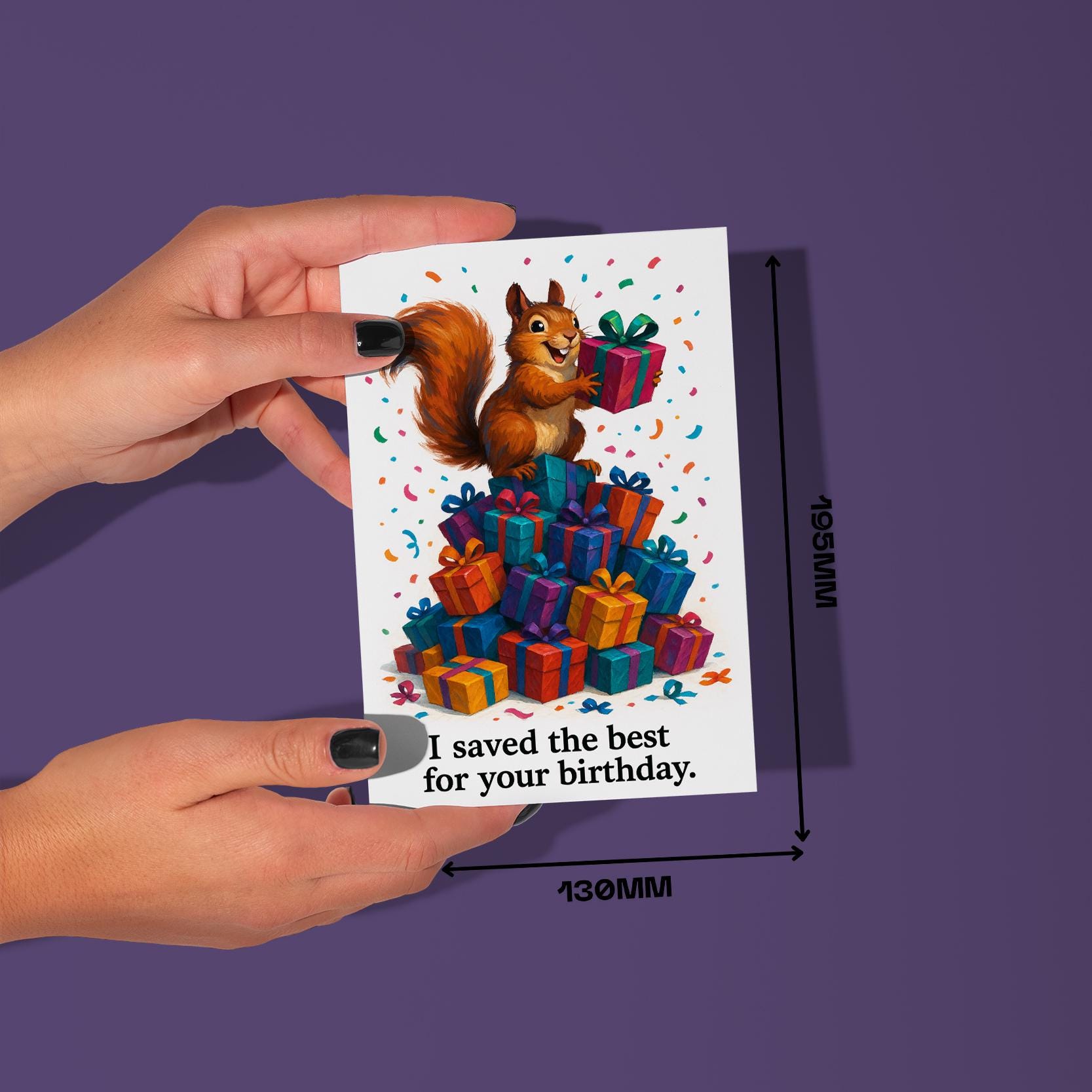 BLANK INTERIOR FOR A PERSONAL TOUCH: Our Gift Hoarder Squirrel - I saved the best for your birthday. Birthday card and other whimsical designs feature a blank interior, giving you ample space to write a personal message from the heart. Perfect for any occasion, each card comes with a matching white envelope, making it easy to send your unique sentiments to loved ones.