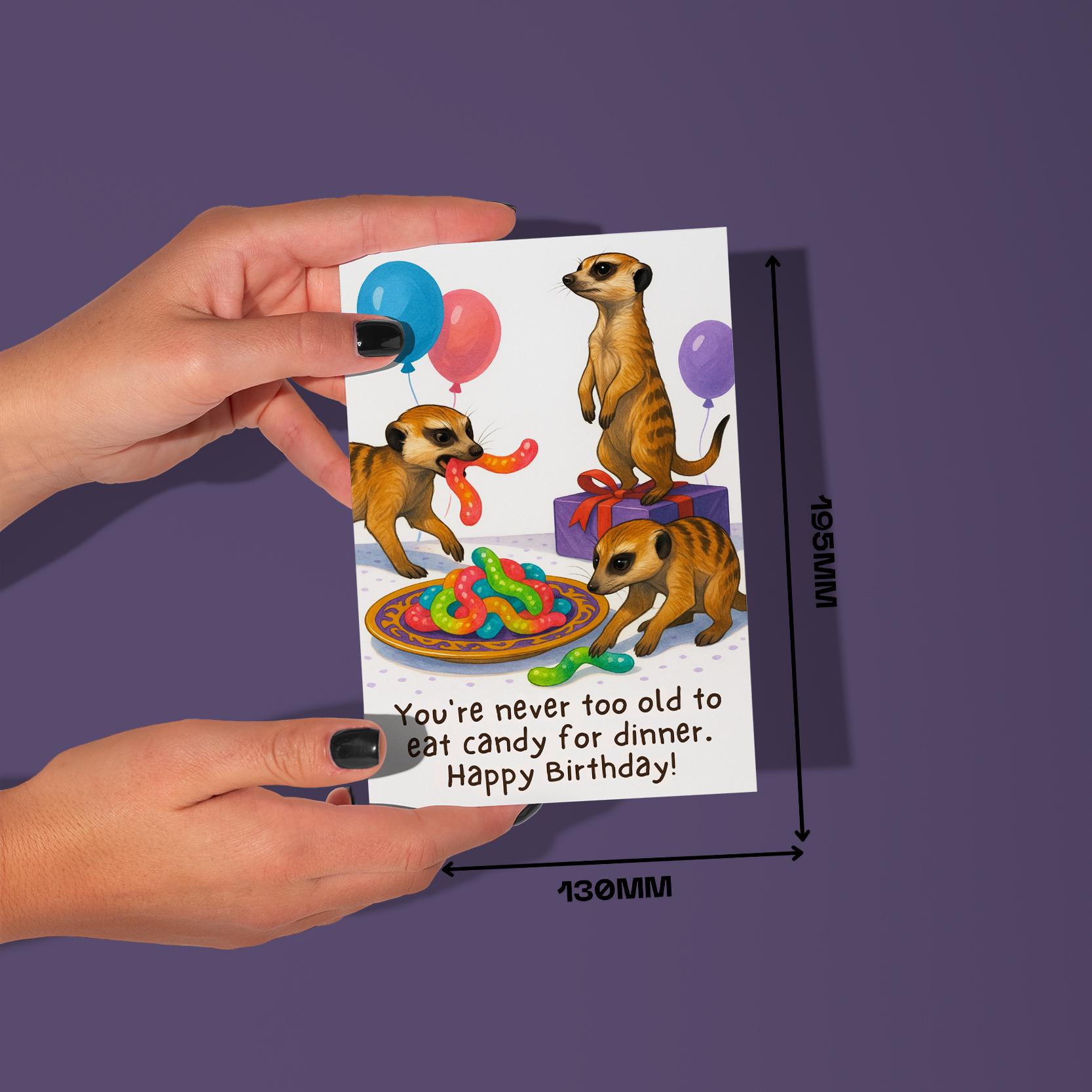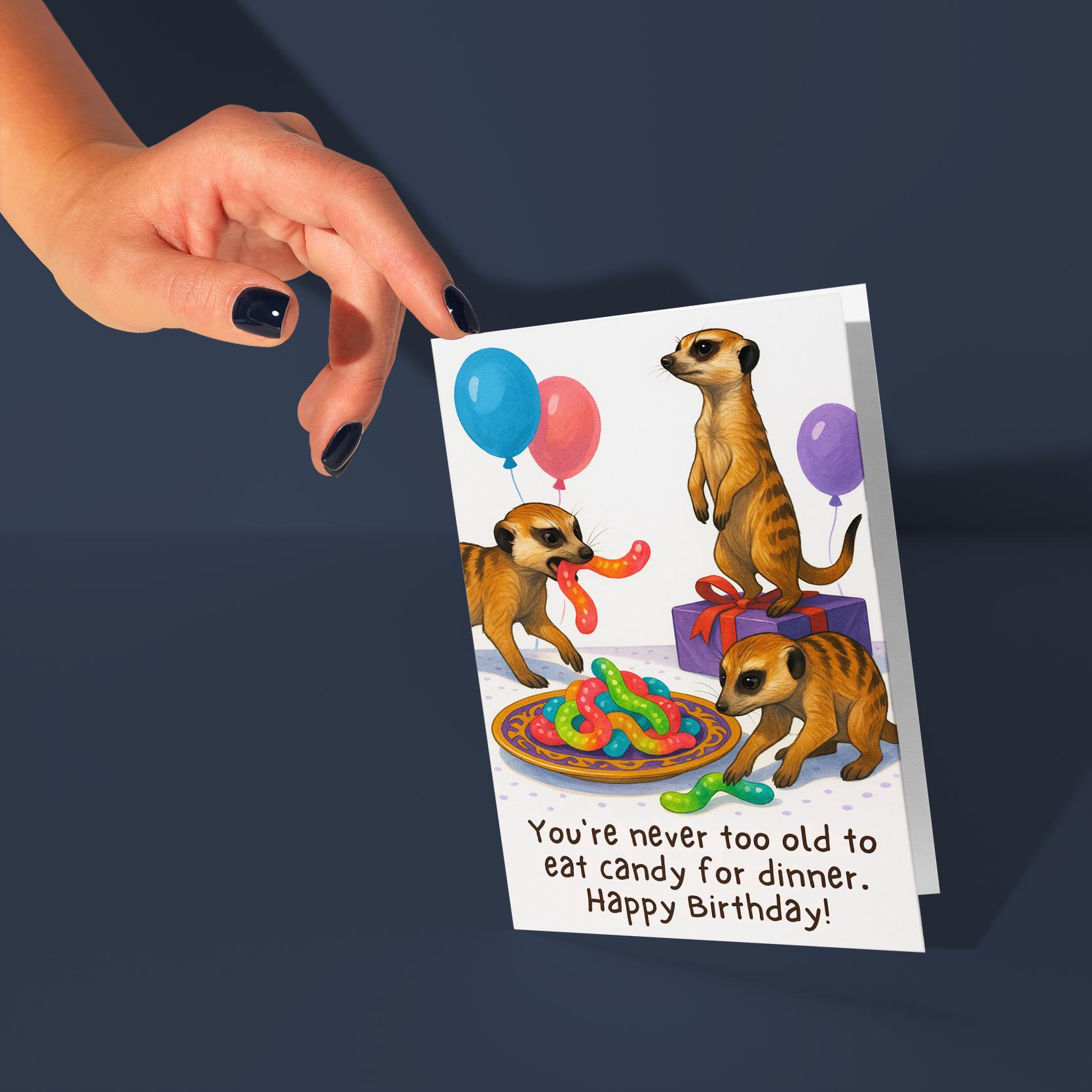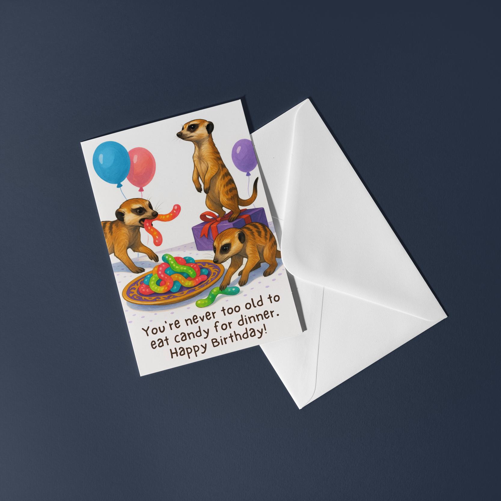 BLANK INTERIOR FOR A PERSONAL TOUCH: Our Candy-Loving Meerkats - You are never too old to eat candy for dinner. Happy Birthday card and other whimsical designs feature a blank interior, giving you ample space to write a personal message from the heart. Perfect for any occasion, each card comes with a matching white envelope, making it easy to send your unique sentiments to loved ones.