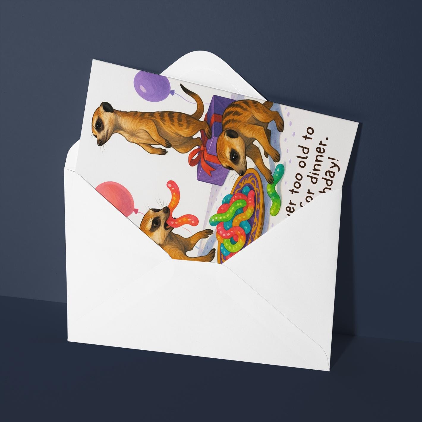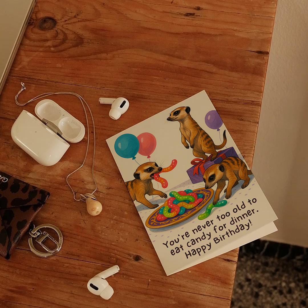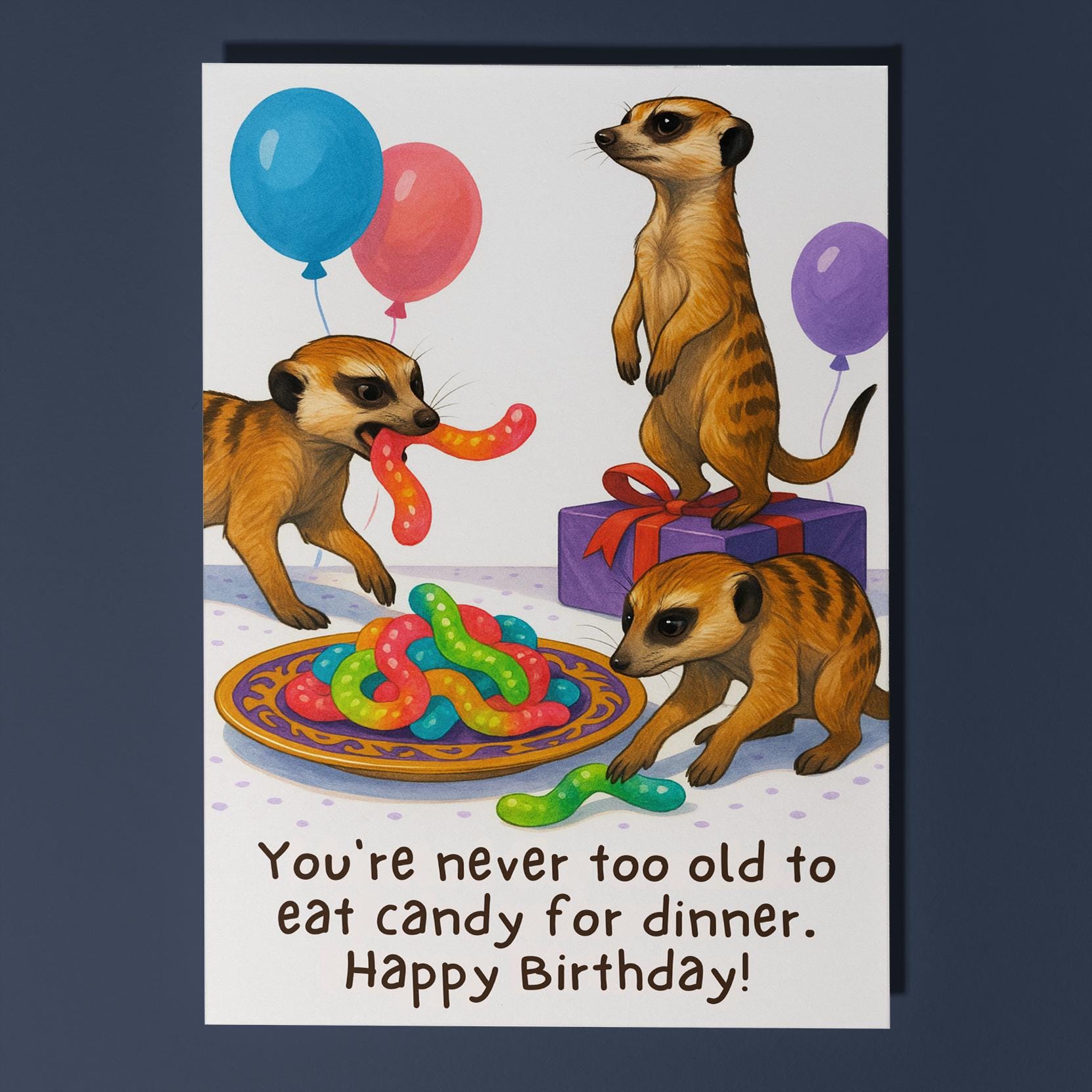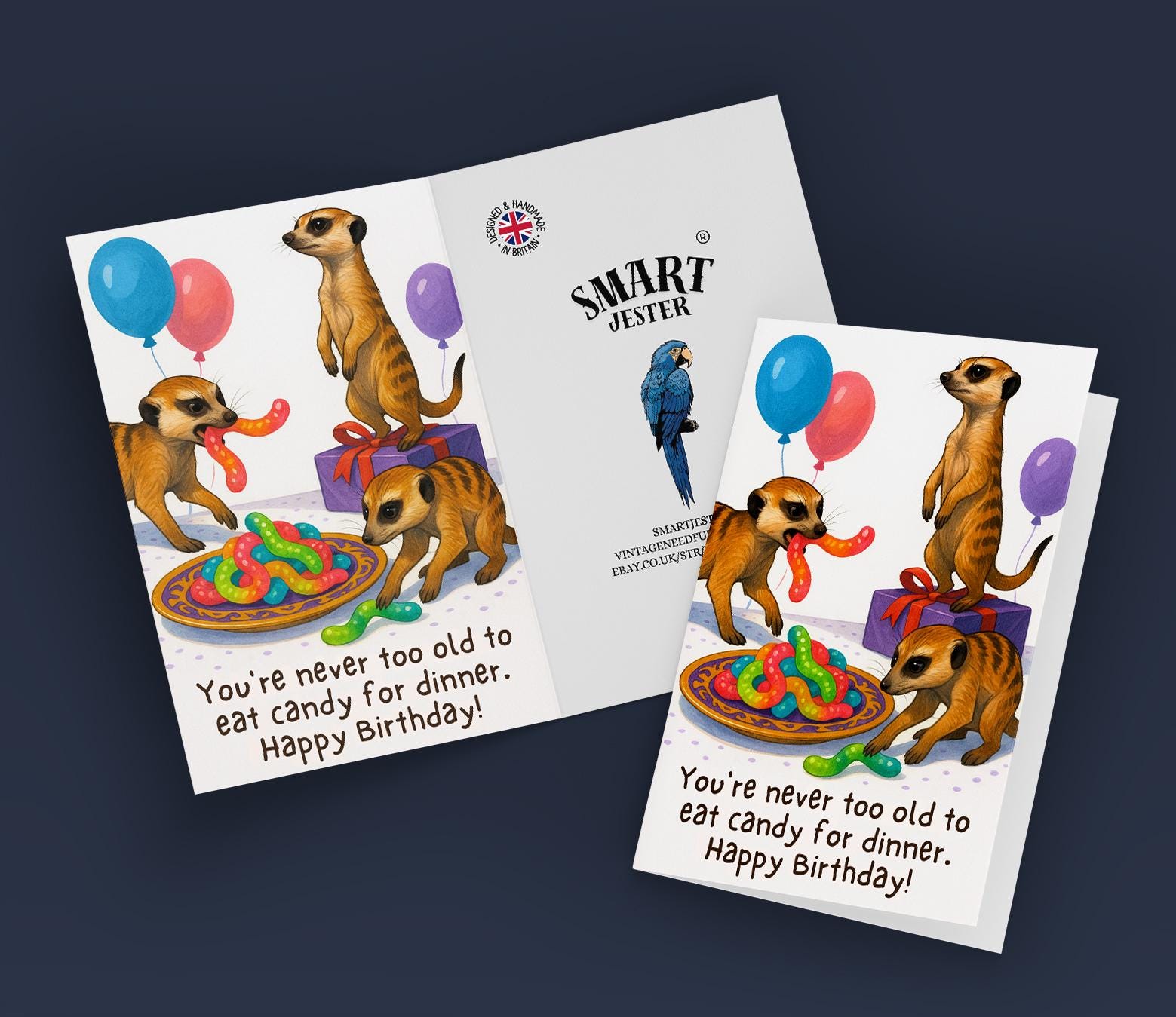 BLANK INTERIOR FOR A PERSONAL TOUCH: Our Candy-Loving Meerkats - You are never too old to eat candy for dinner. Happy Birthday card and other whimsical designs feature a blank interior, giving you ample space to write a personal message from the heart. Perfect for any occasion, each card comes with a matching white envelope, making it easy to send your unique sentiments to loved ones.