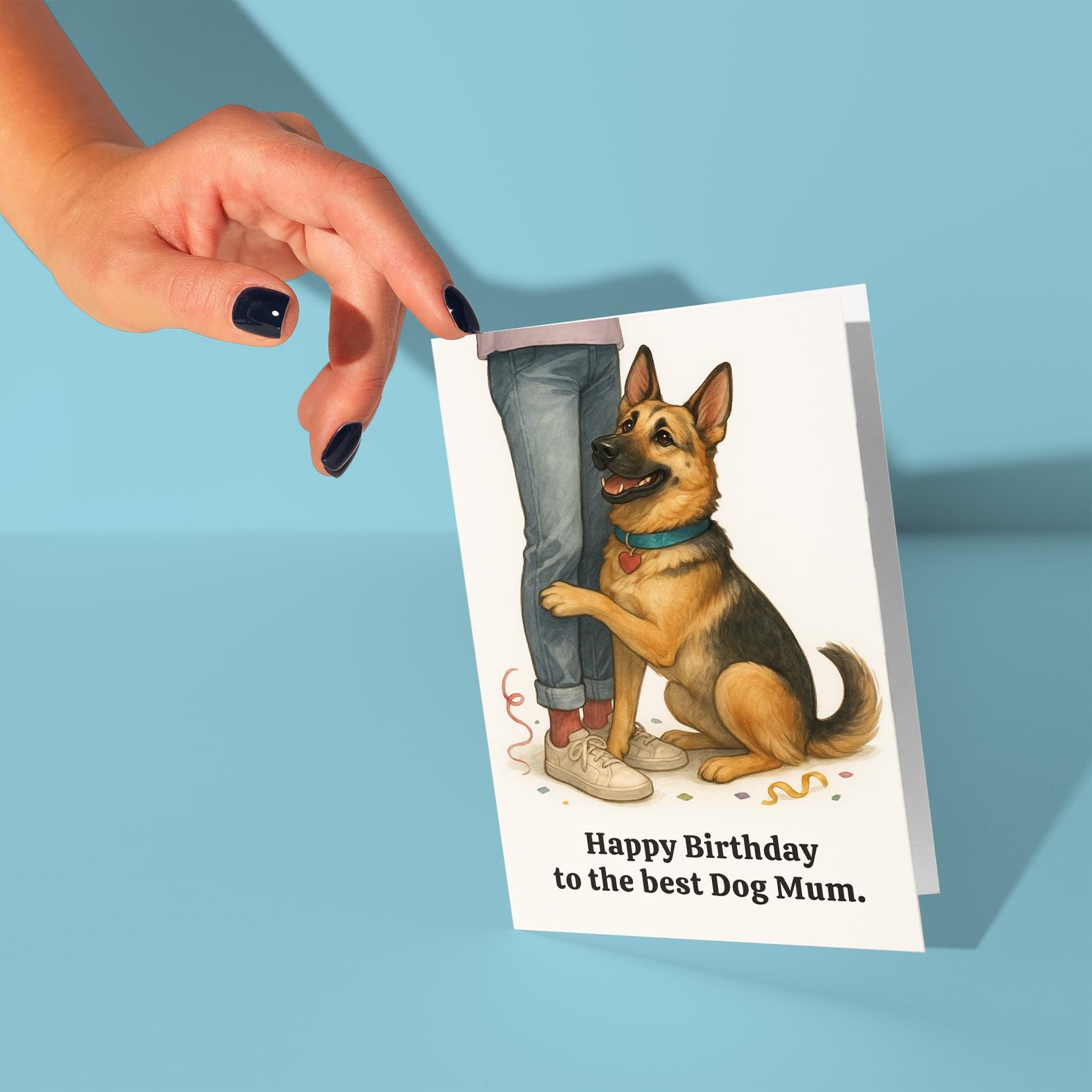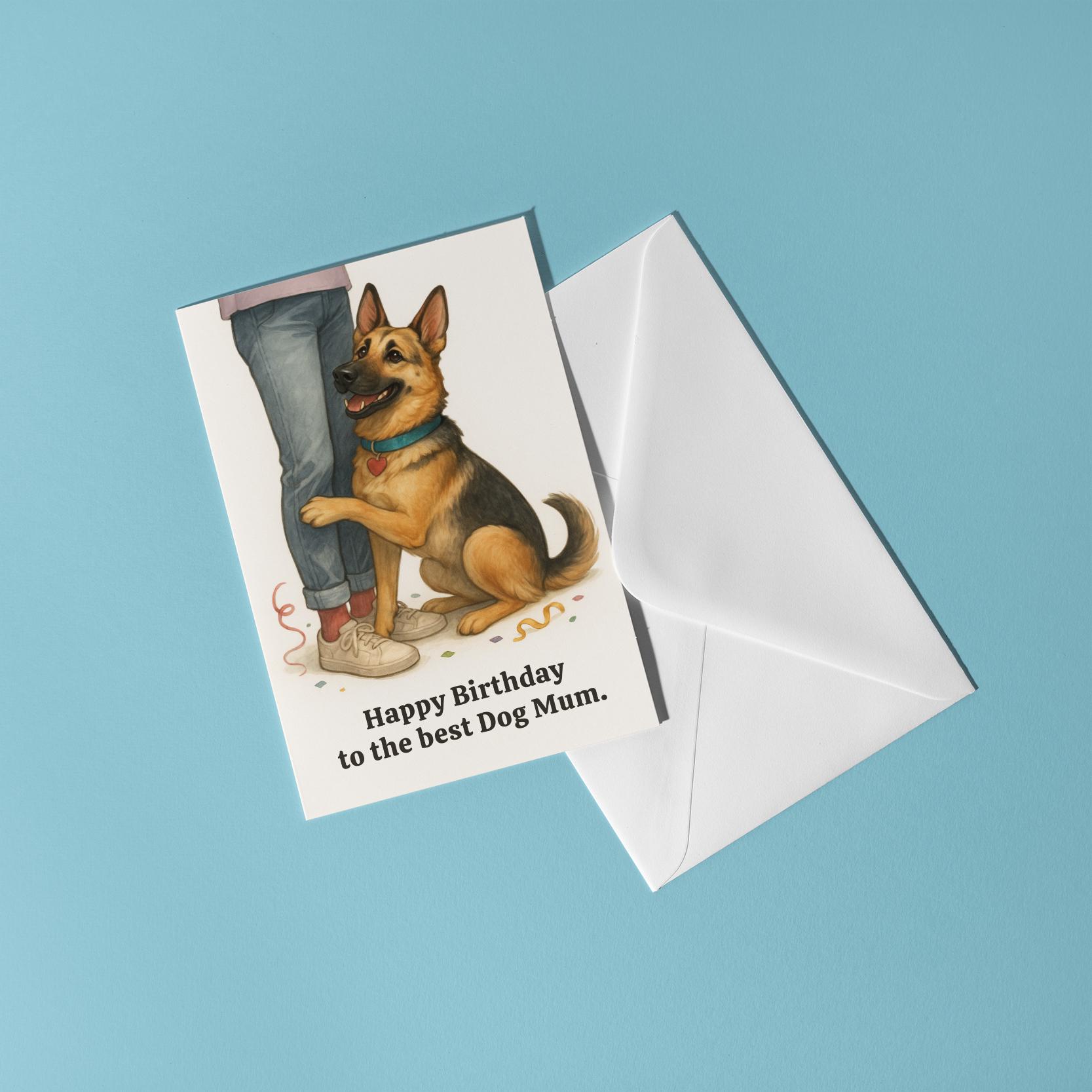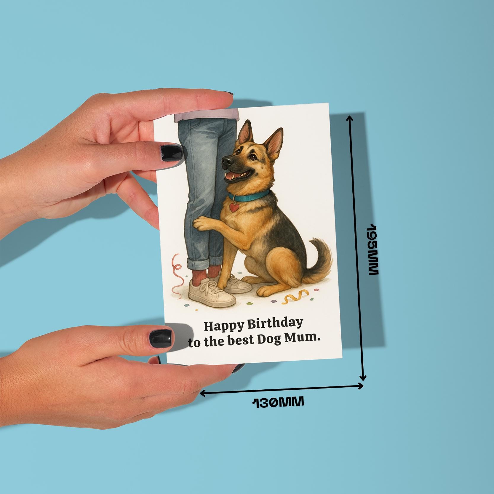 BLANK INTERIOR FOR A PERSONAL TOUCH: My Human Is the Best Collection - German Shepherd dog Happy Birthday to the best dog mum card. A heart-melting series of dog-themed greeting cards celebrating the special bond between pups and their favourite humans. Each design shows adorable doggos expressing pure love, loyalty and joy - perfect for Dog Mums, Dog Dads, and everyone who has a furry best friend - and other whimsical designs feature a blank interior, giving you ample space to write a personal message from the heart. Perfect for any occasion, each card comes with a matching white envelope, making it easy to send your unique sentiments to loved ones.