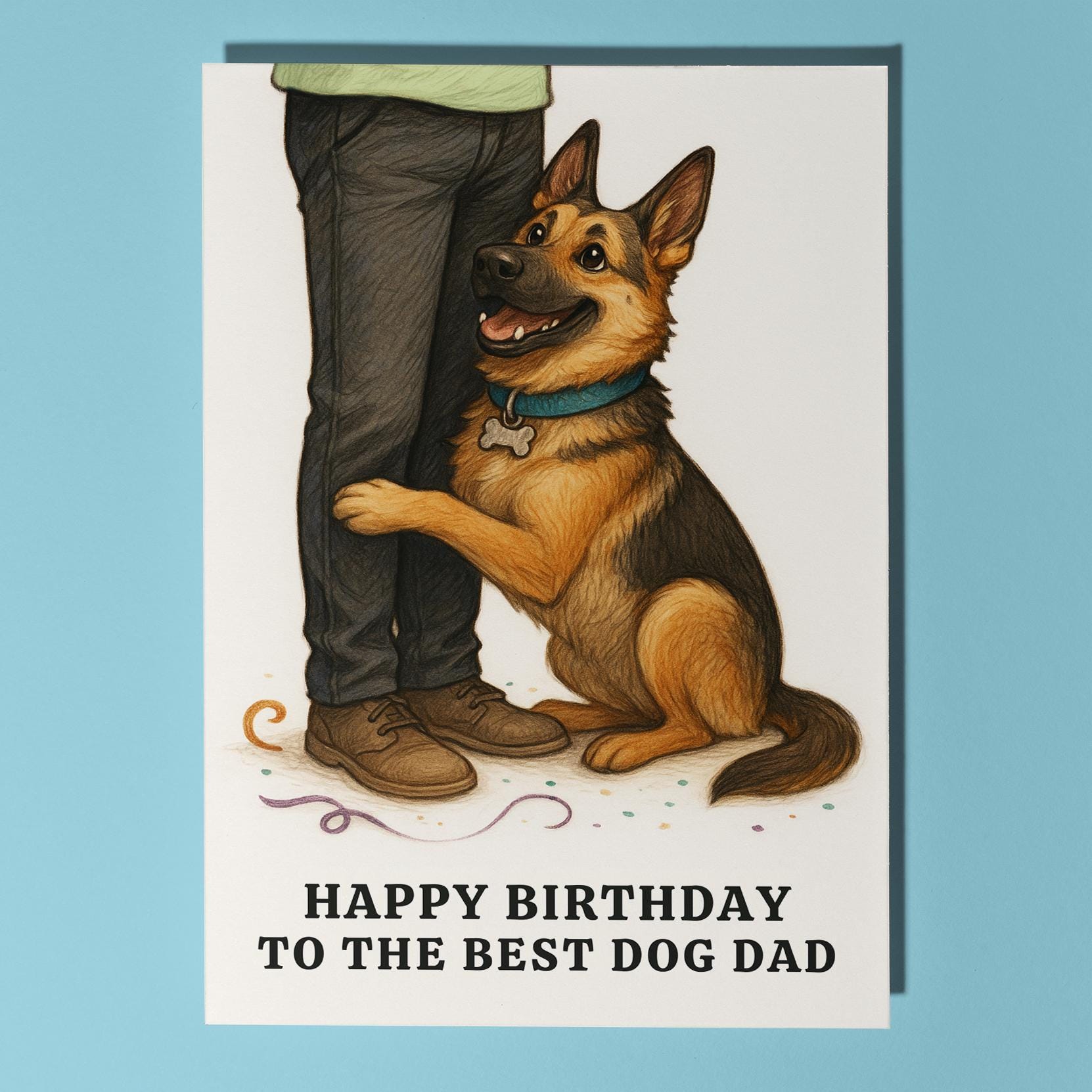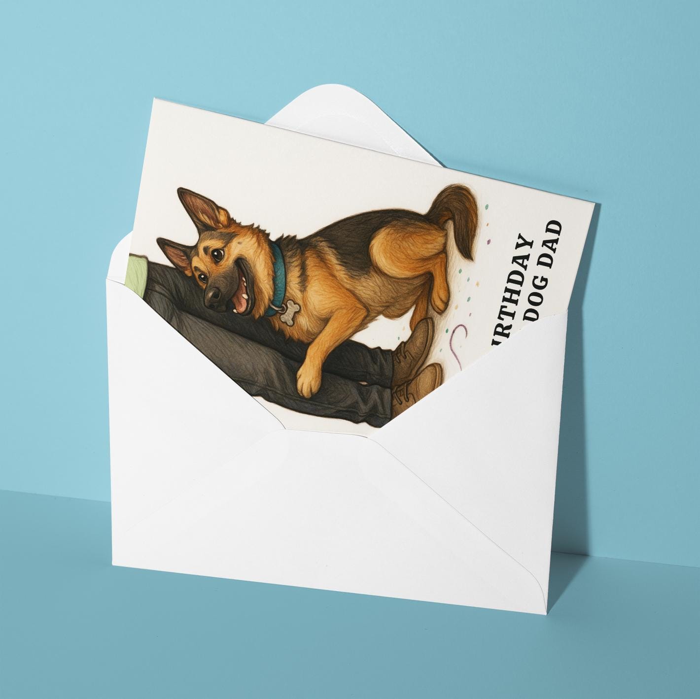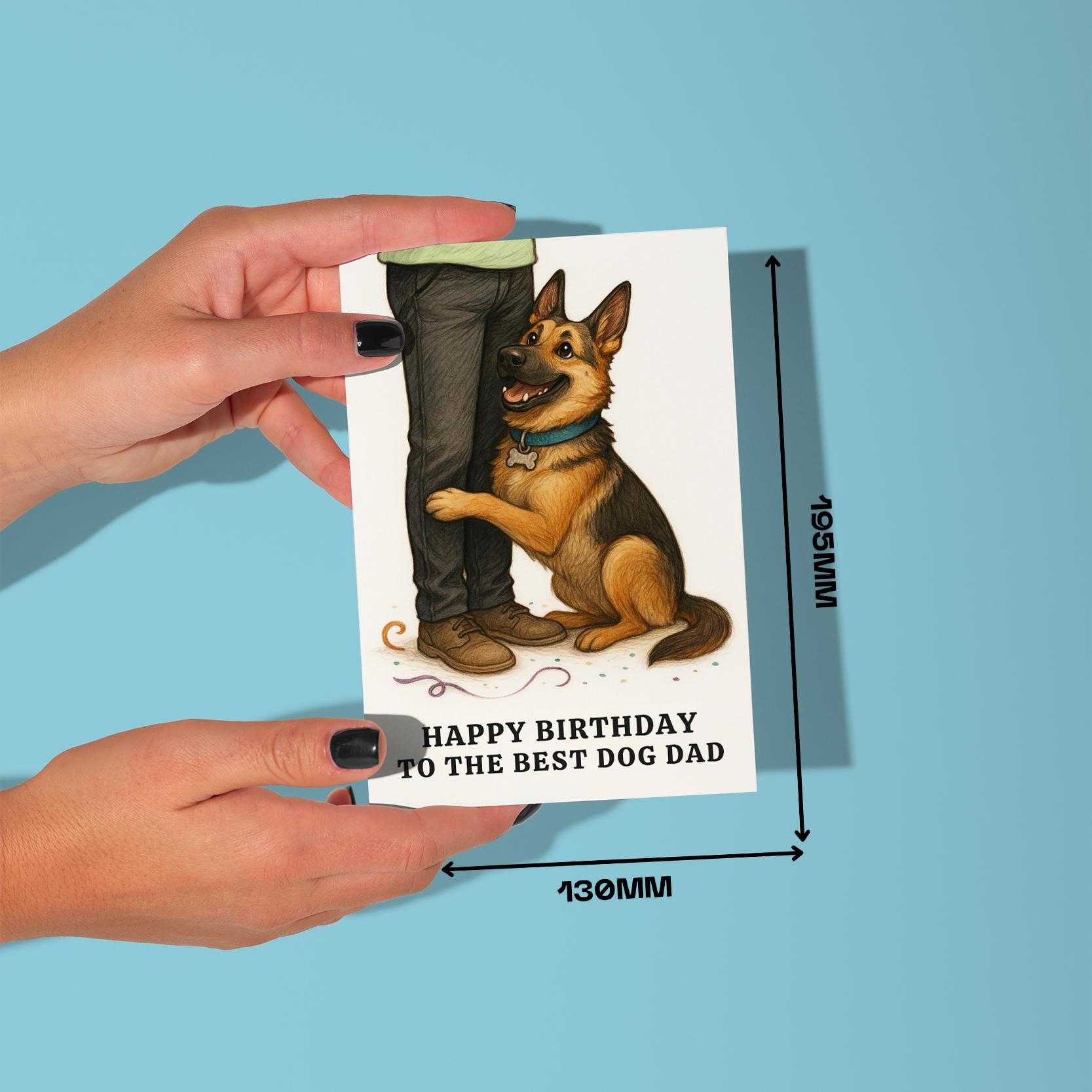 BLANK INTERIOR FOR A PERSONAL TOUCH: My Human Is the Best Collection - German Shepherd dog Happy Birthday to the best dog dad card. A heart-melting series of dog-themed greeting cards celebrating the special bond between pups and their favourite humans. Each design shows adorable doggos expressing pure love, loyalty and joy - perfect for Dog Mums, Dog Dads, and everyone who has a furry best friend - and other whimsical designs feature a blank interior, giving you ample space to write a personal message from the heart. Perfect for any occasion, each card comes with a matching white envelope, making it easy to send your unique sentiments to loved ones.