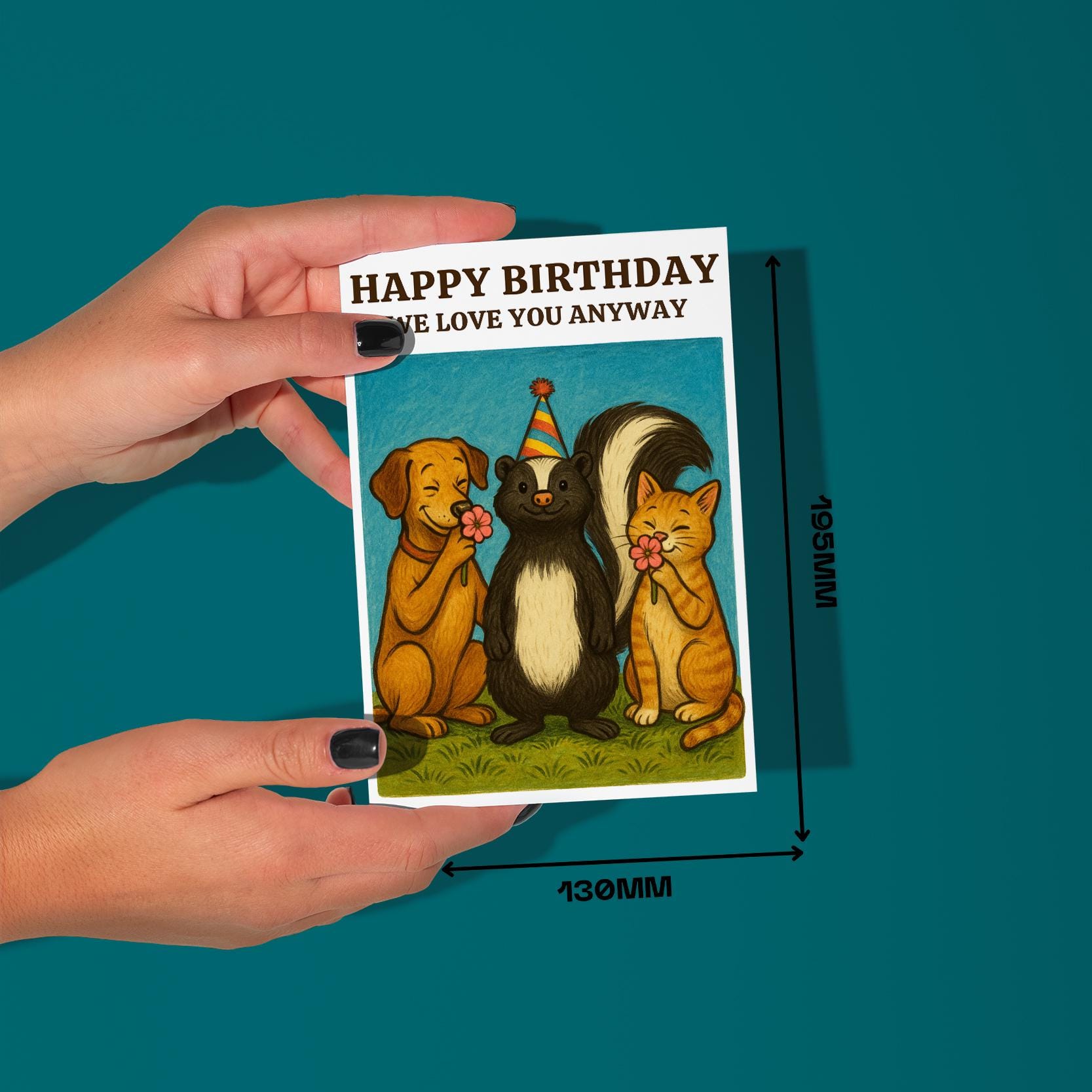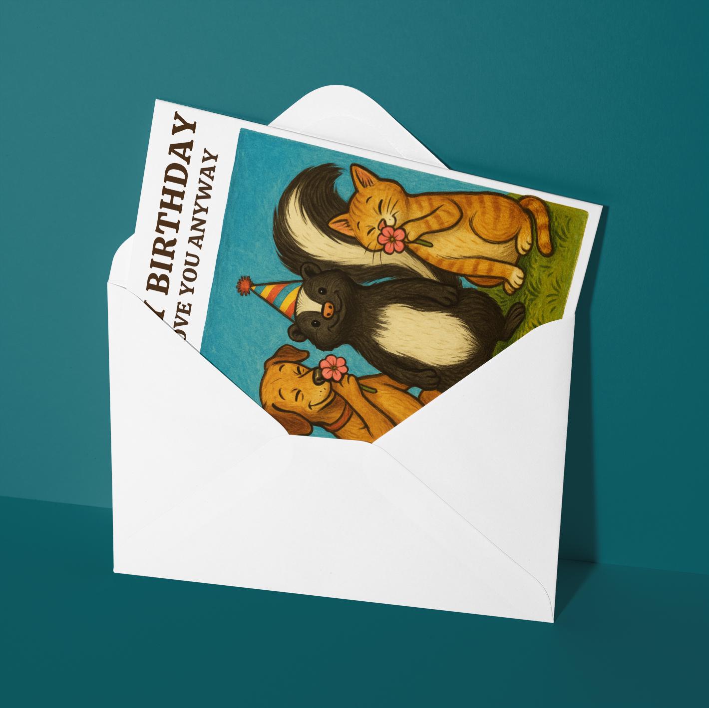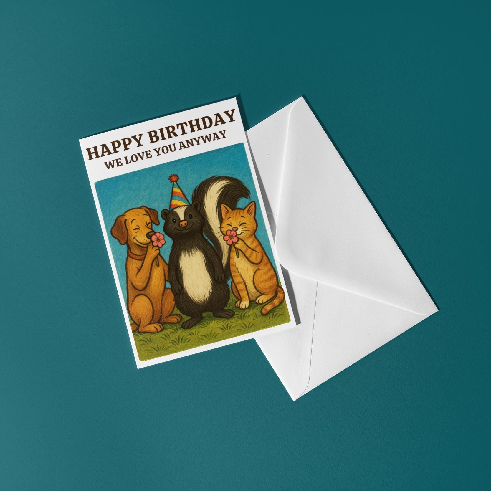 BLANK INTERIOR FOR A PERSONAL TOUCH: Our Skunk - We love you anyway Happy Birthday card and other whimsical designs feature a blank interior, giving you ample space to write a personal message from the heart. Perfect for any occasion, each card comes with a matching white envelope, making it easy to send your unique sentiments to loved ones.