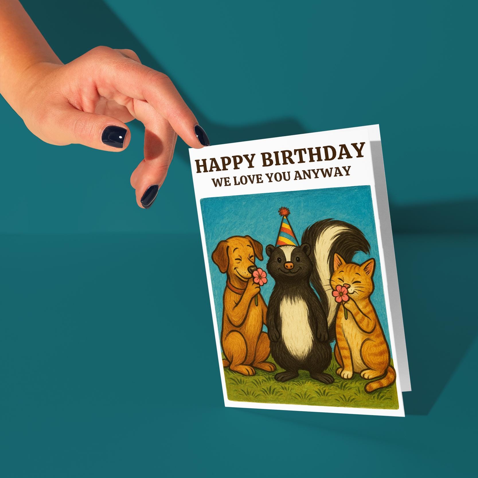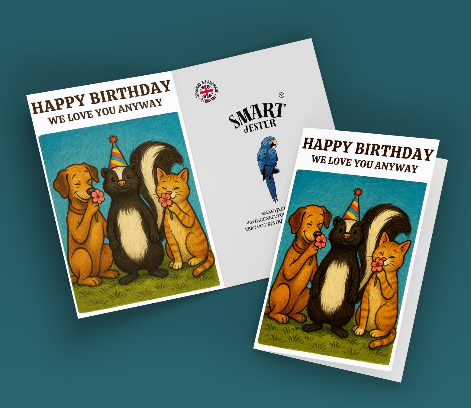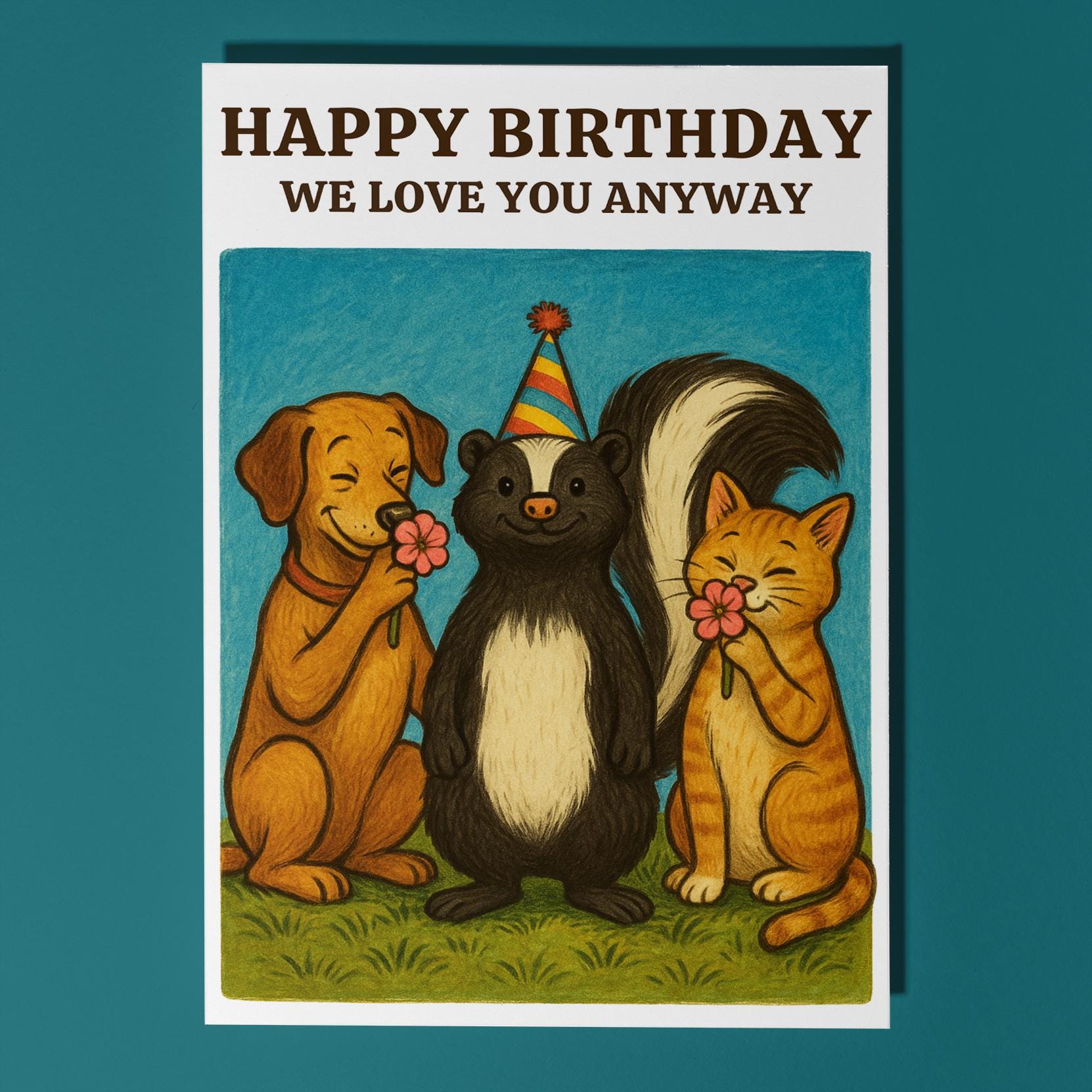 BLANK INTERIOR FOR A PERSONAL TOUCH: Our Skunk - We love you anyway Happy Birthday card and other whimsical designs feature a blank interior, giving you ample space to write a personal message from the heart. Perfect for any occasion, each card comes with a matching white envelope, making it easy to send your unique sentiments to loved ones.