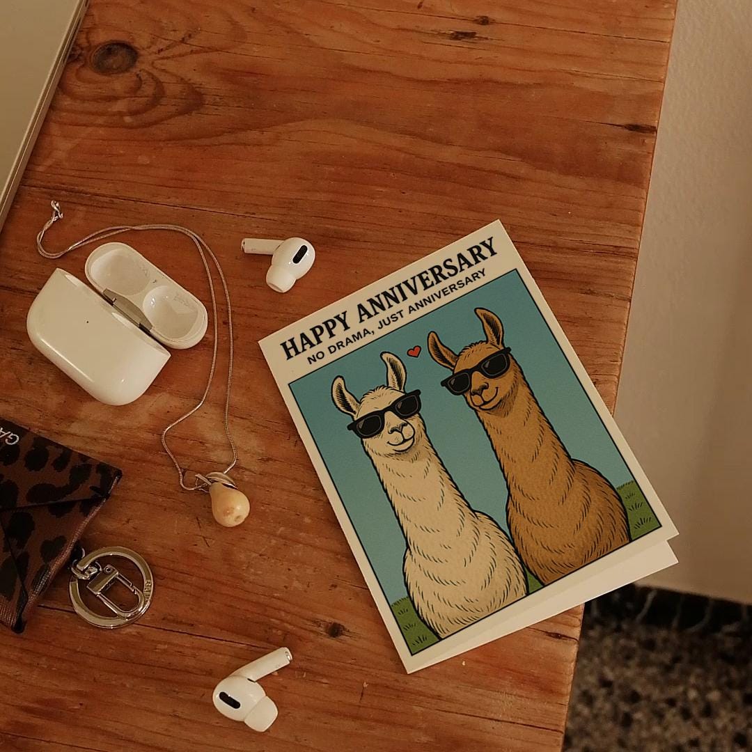 BLANK INTERIOR FOR A PERSONAL TOUCH: Our Llama - No drama, just anniversary Happy Anniversary Card and other whimsical designs feature a blank interior, giving you ample space to write a personal message from the heart. Perfect for any occasion, each card comes with a matching white envelope, making it easy to send your unique sentiments to loved ones.