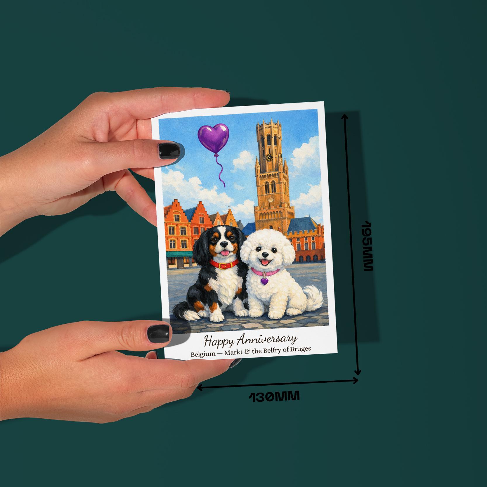 BLANK INTERIOR FOR A PERSONAL TOUCH: Our Paws & Places Collection - Bruges Belgium — Markt & the Belfry of Bruges - Bichon Frise and Cavalier King Charles Spaniel Dogs Happy Anniversary Card and other whimsical designs feature a blank interior, giving you ample space to write a personal message from the heart. Perfect for any occasion, each card comes with a matching white envelope, making it easy to send your unique sentiments to loved ones.