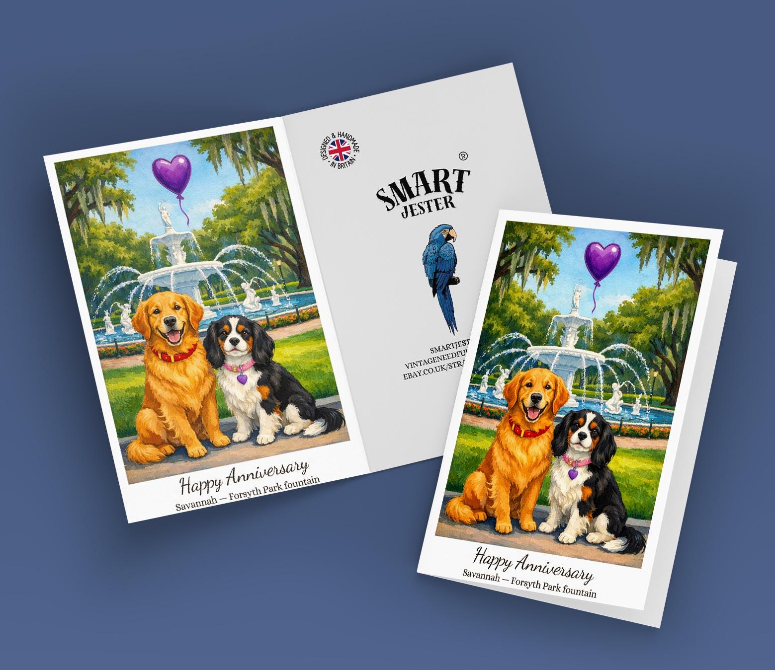 BLANK INTERIOR FOR A PERSONAL TOUCH: Our Paws & Places Collection - Savannah - Forsyth Park - Golden Retriever and Cavalier King Charles Spaniel Dogs Happy Anniversary Card and other whimsical designs feature a blank interior, giving you ample space to write a personal message from the heart. Perfect for any occasion, each card comes with a matching white envelope, making it easy to send your unique sentiments to loved ones.