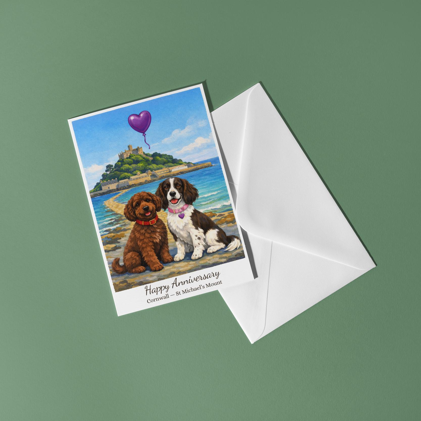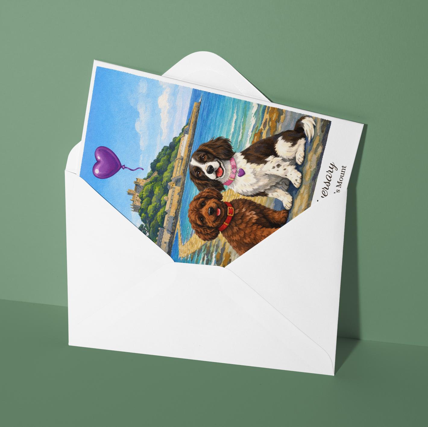 BLANK INTERIOR FOR A PERSONAL TOUCH: Our Paws & Places Collection - Cornwall - St Michael’s Mount Cockapoo Springer Spaniel Dogs Happy Anniversary Card and other whimsical designs feature a blank interior, giving you ample space to write a personal message from the heart. Perfect for any occasion, each card comes with a matching white envelope, making it easy to send your unique sentiments to loved ones.