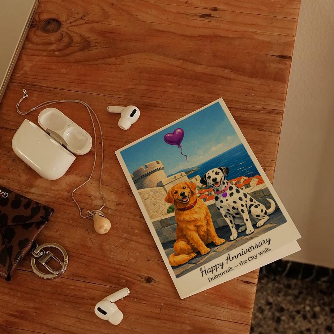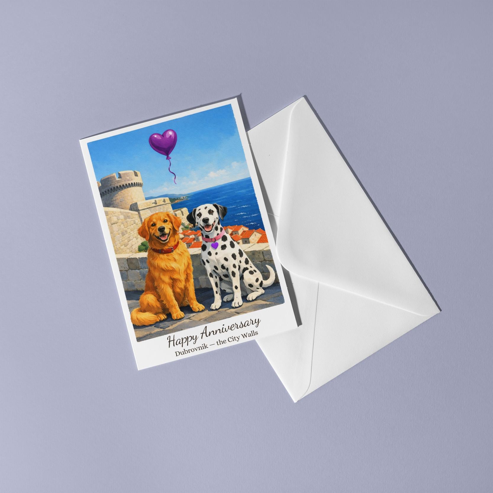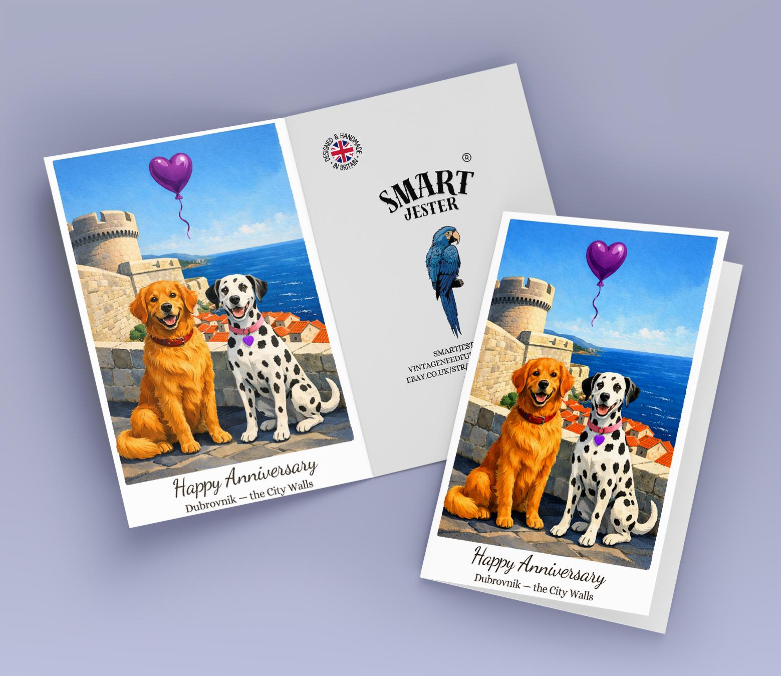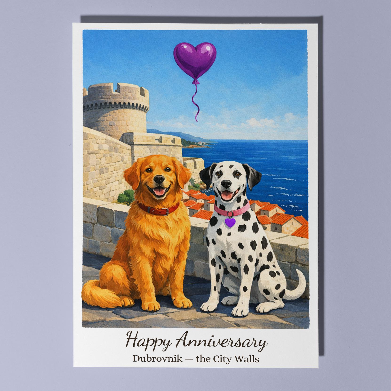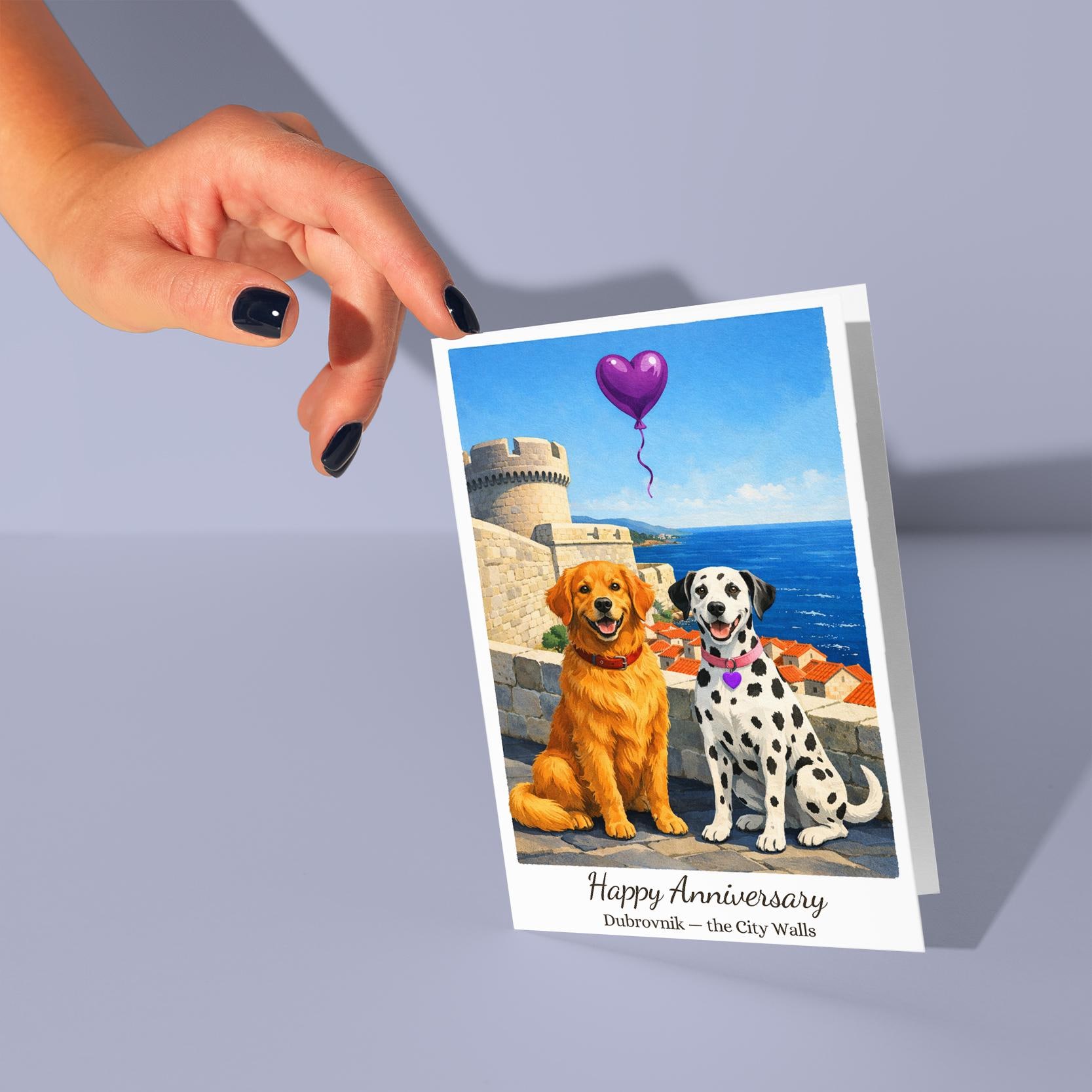 BLANK INTERIOR FOR A PERSONAL TOUCH: Our Paws & Places Collection - Croatia Dubrovnik - the City Walls Golden Retriever and Dalmatian Dogs Happy Anniversary Card and other whimsical designs feature a blank interior, giving you ample space to write a personal message from the heart. Perfect for any occasion, each card comes with a matching white envelope, making it easy to send your unique sentiments to loved ones.