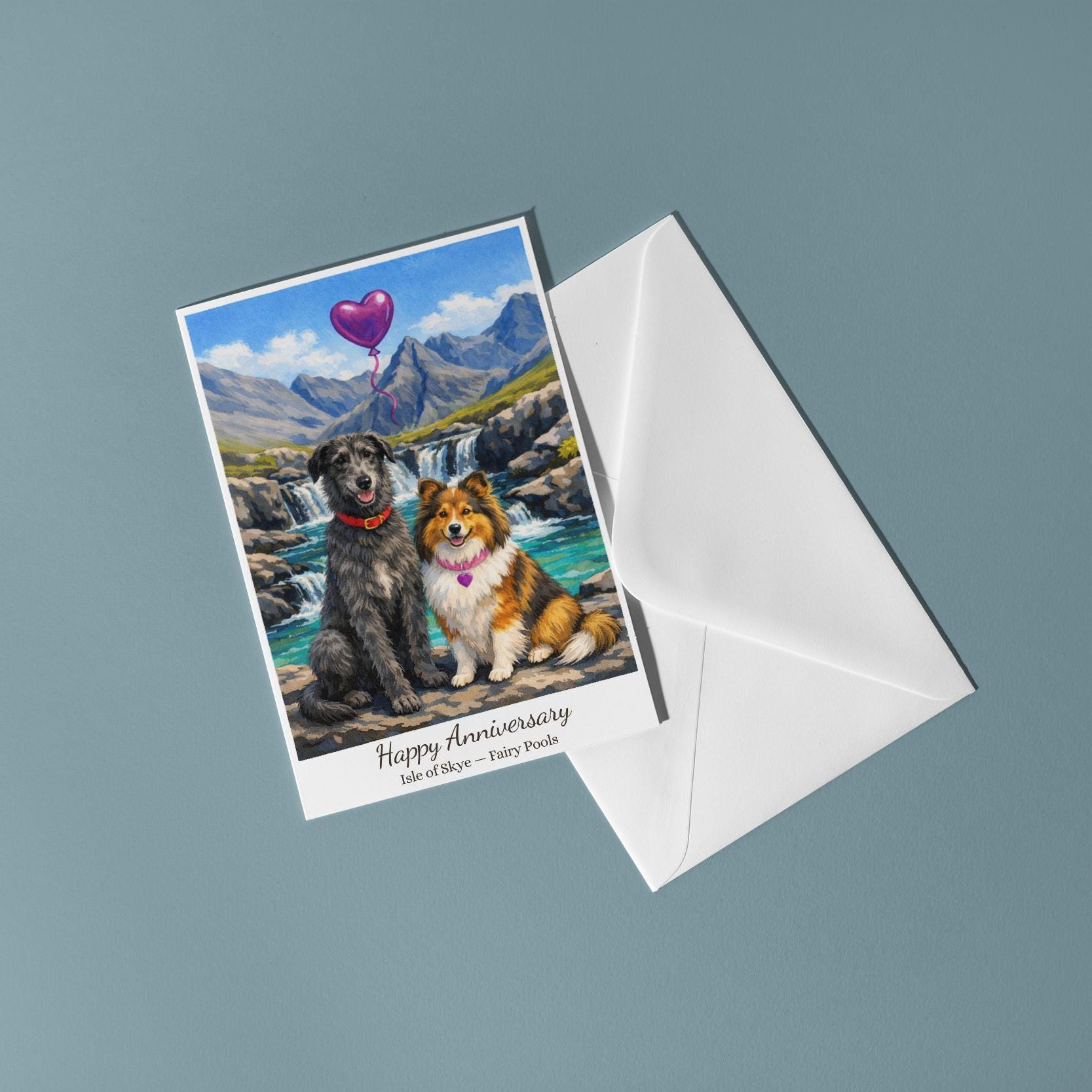 BLANK INTERIOR FOR A PERSONAL TOUCH: Our Paws & Places Collection - Isle of Skye - Fairy Pools - Scottish Deerhound Shetland Sheepdog Dogs Happy Anniversary Card and other whimsical designs feature a blank interior, giving you ample space to write a personal message from the heart. Perfect for any occasion, each card comes with a matching white envelope, making it easy to send your unique sentiments to loved ones.