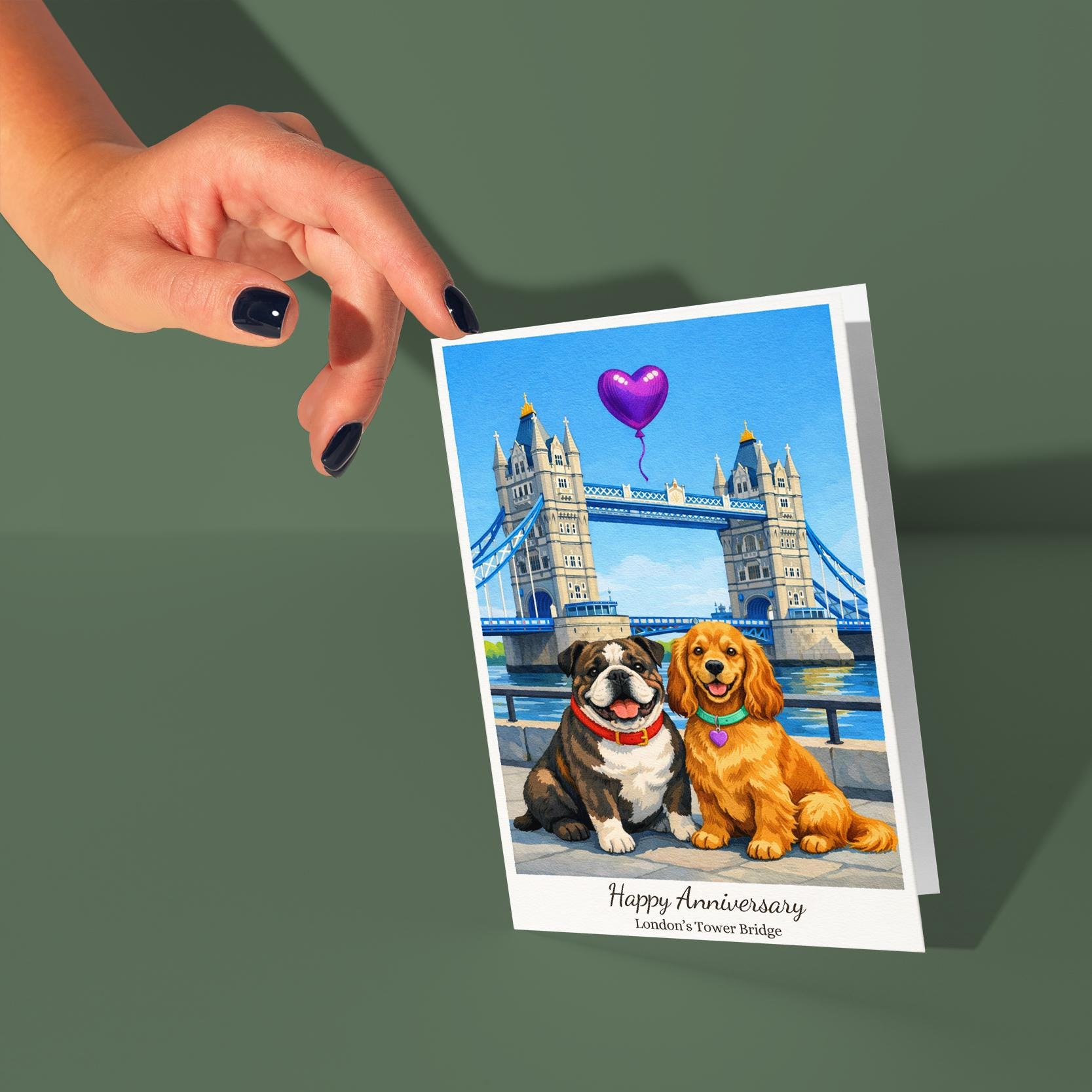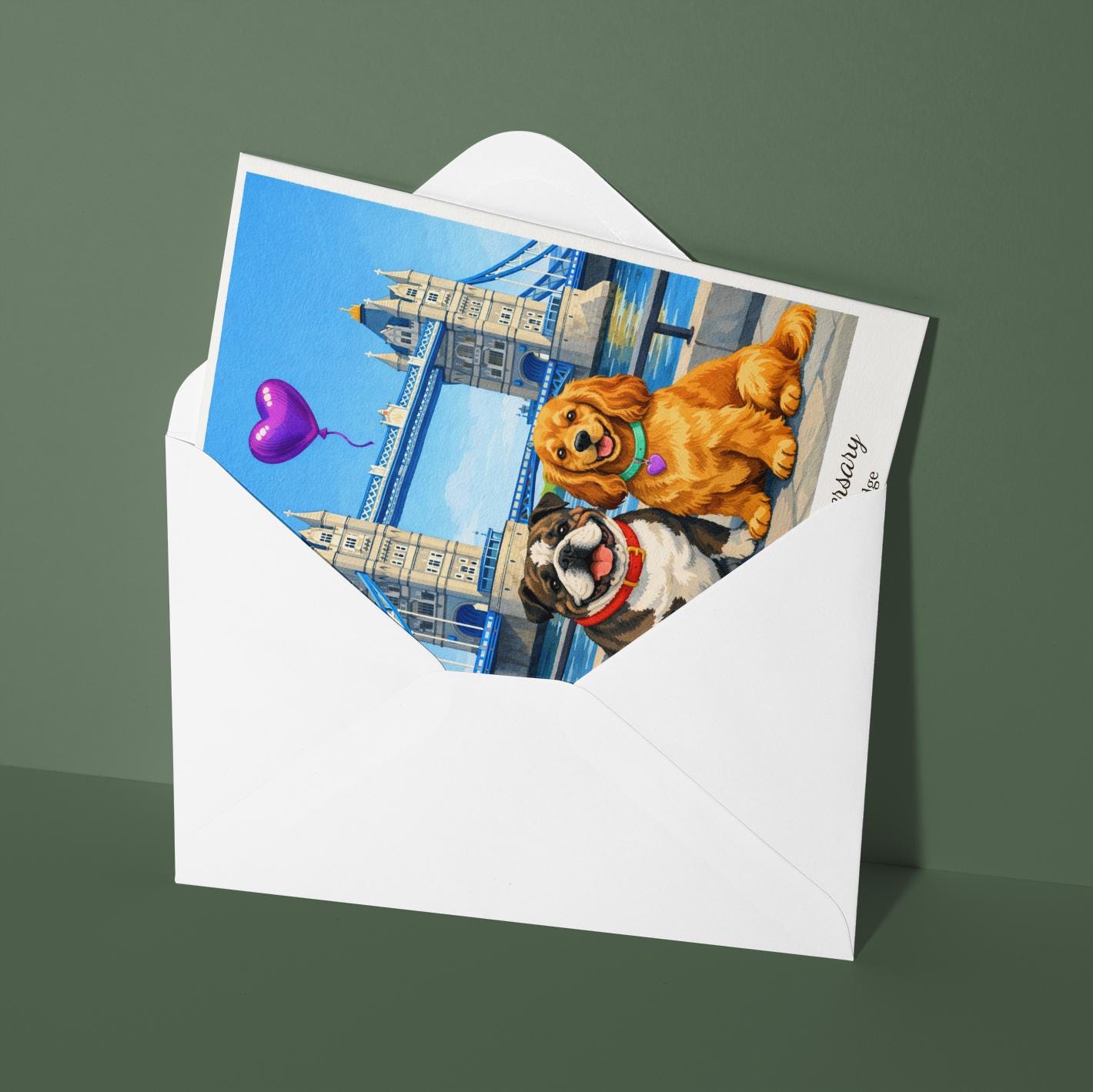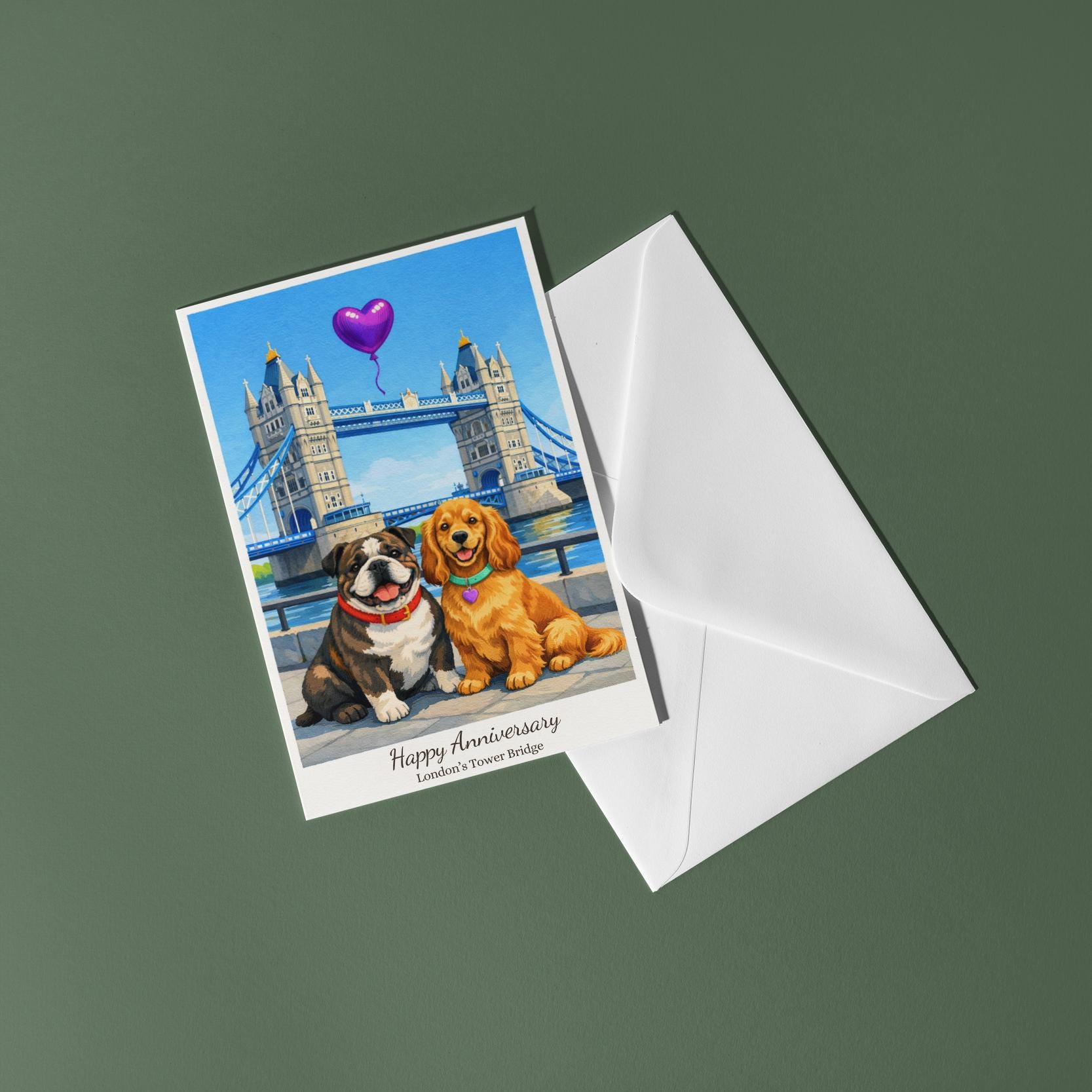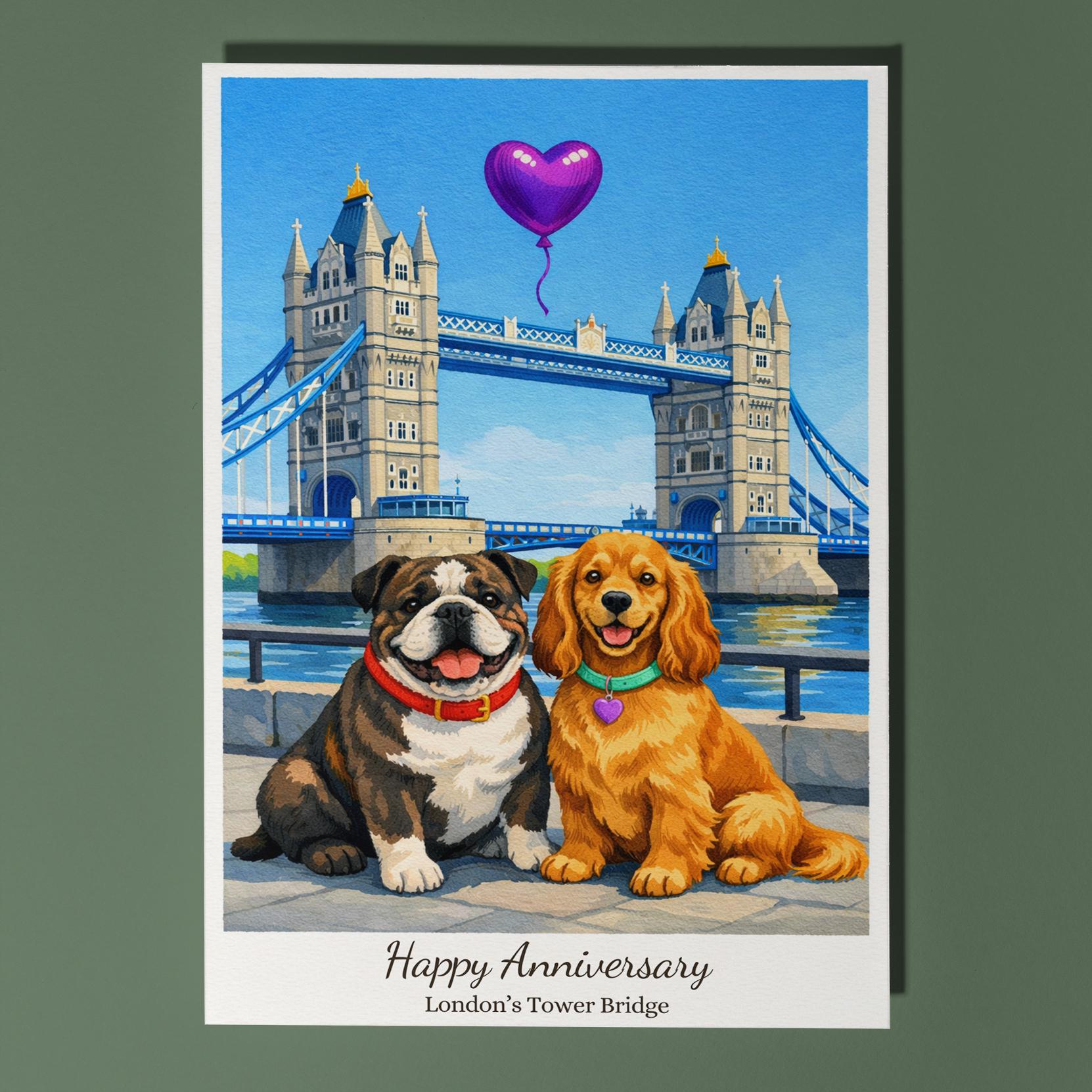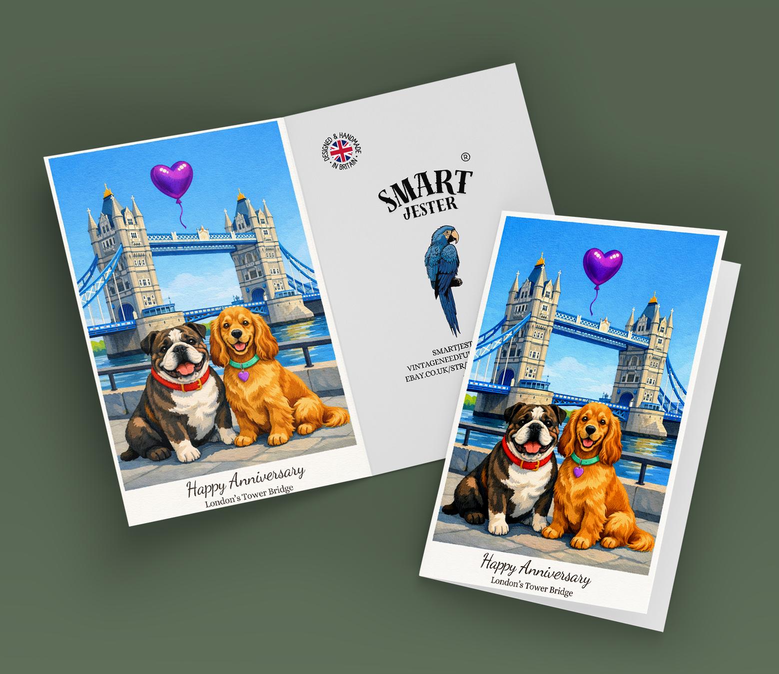 BLANK INTERIOR FOR A PERSONAL TOUCH: Our Paws & Places Collection - London's Tower Bridge - Cocker Spaniel and English Bulldog Dogs Happy Anniversary Card and other whimsical designs feature a blank interior, giving you ample space to write a personal message from the heart. Perfect for any occasion, each card comes with a matching white envelope, making it easy to send your unique sentiments to loved ones.