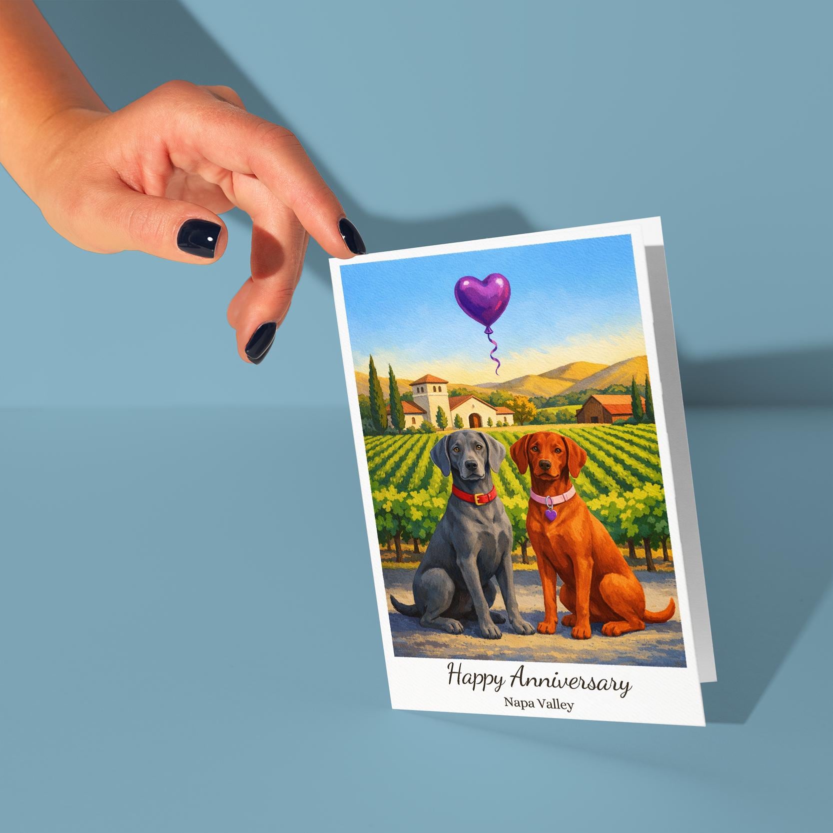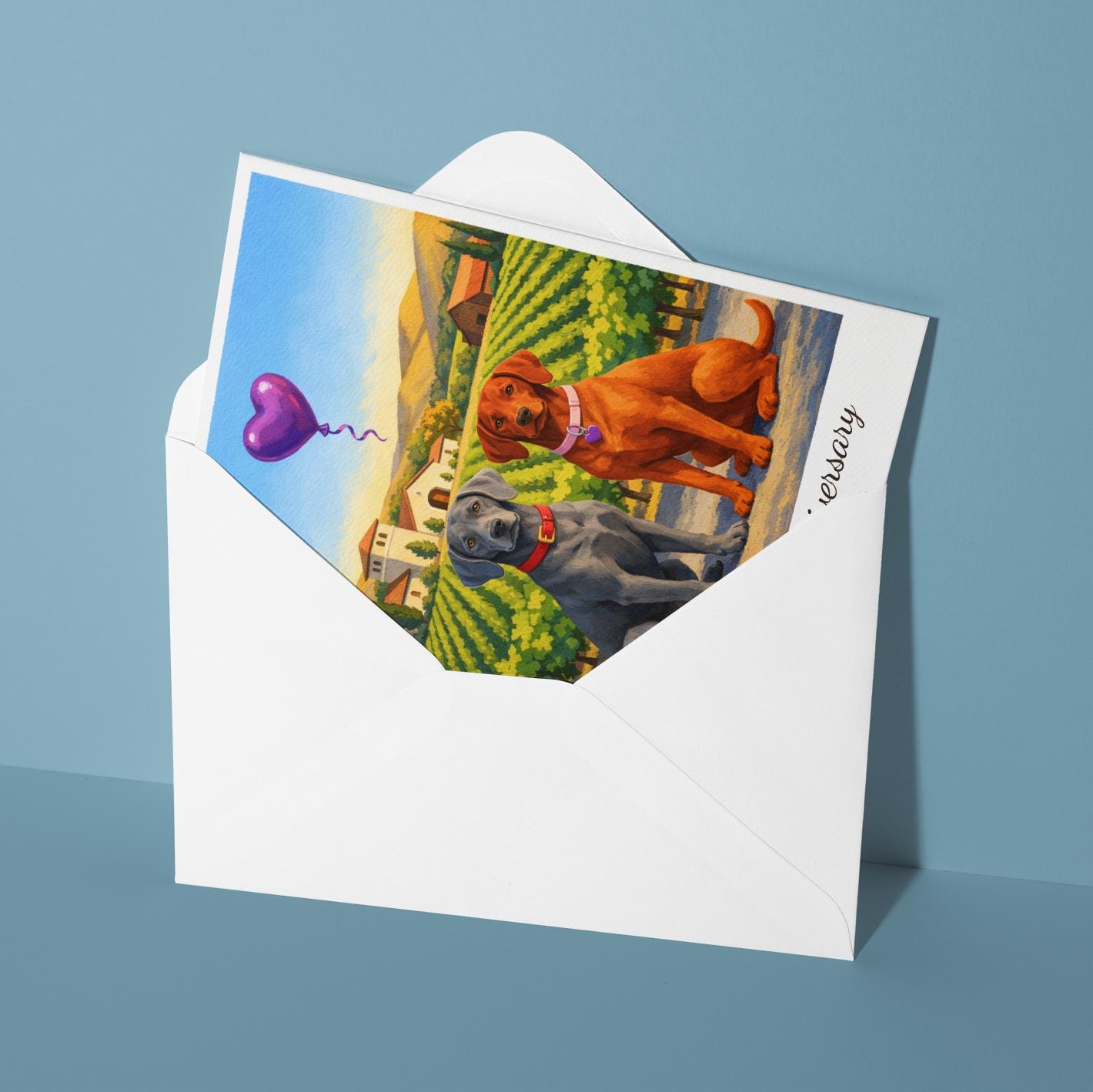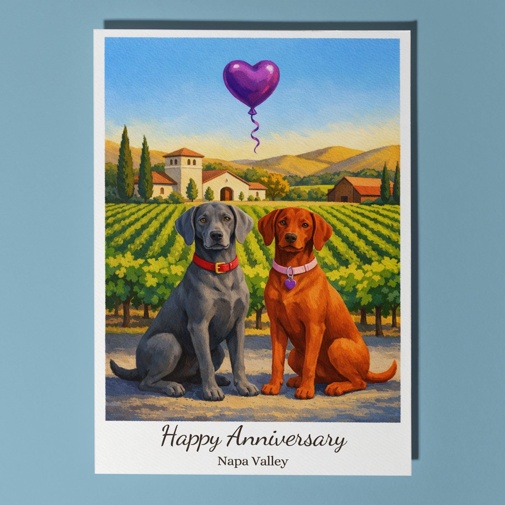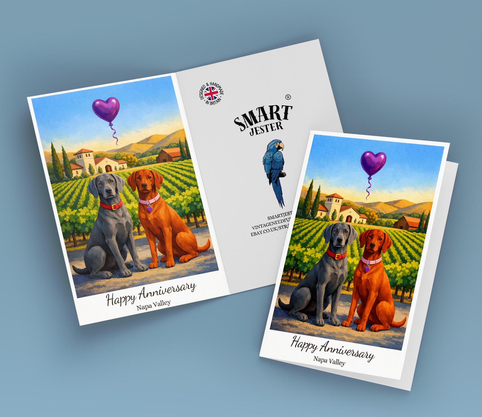 BLANK INTERIOR FOR A PERSONAL TOUCH: Our Paws & Places Collection - Napa Valley - Weimaraner and Vizsla Dogs Happy Anniversary Card and other whimsical designs feature a blank interior, giving you ample space to write a personal message from the heart. Perfect for any occasion, each card comes with a matching white envelope, making it easy to send your unique sentiments to loved ones.