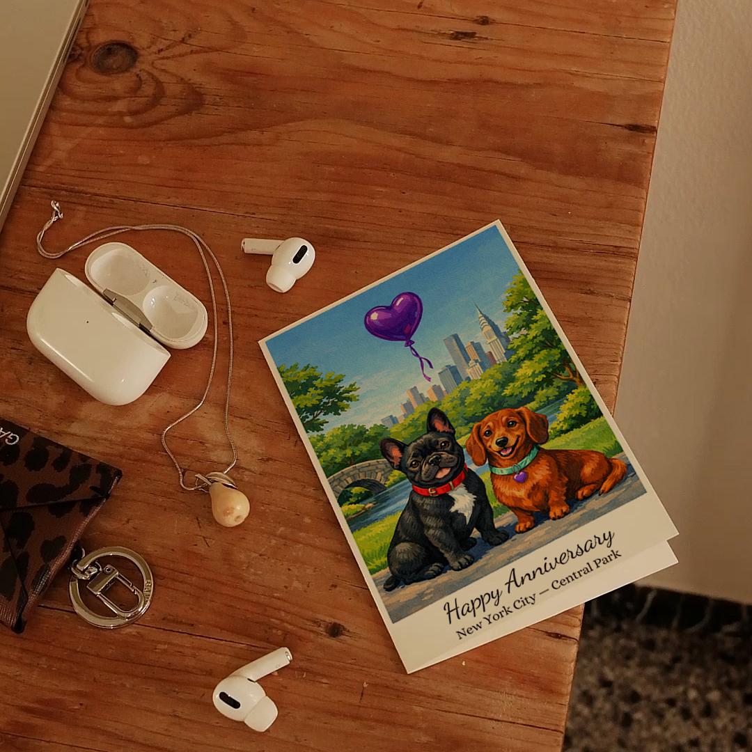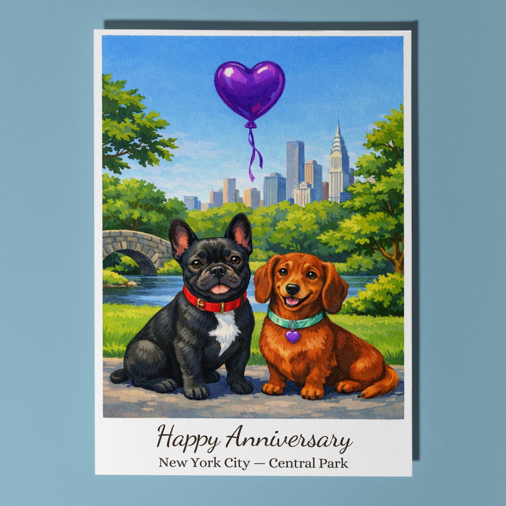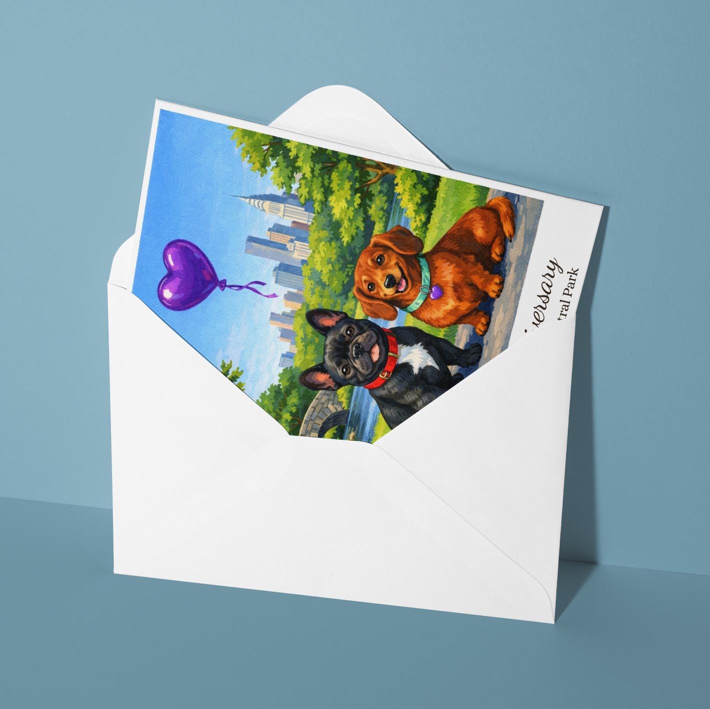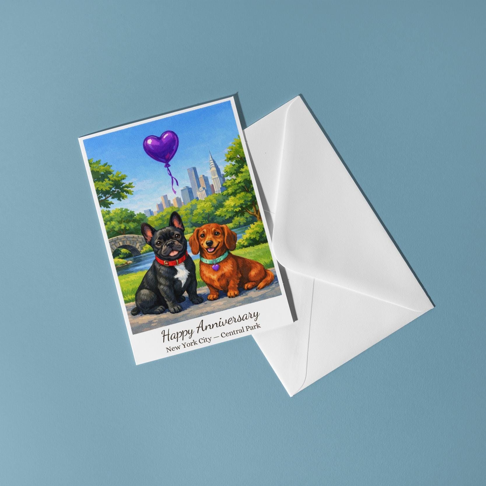 BLANK INTERIOR FOR A PERSONAL TOUCH: Our Paws & Places Collection - New York City Central Park French Bulldog and Dachshund Dogs Happy Anniversary Card and other whimsical designs feature a blank interior, giving you ample space to write a personal message from the heart. Perfect for any occasion, each card comes with a matching white envelope, making it easy to send your unique sentiments to loved ones.
