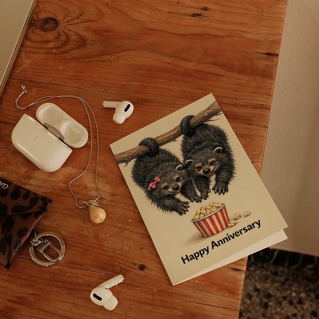 BLANK INTERIOR FOR A PERSONAL TOUCH: Our Animal Hugs Collection - Bearcat Movie Night (Binturong) Happy Anniversary Card - Native to the forests of Southeast Asia, the bearcat (binturong) is famous for its natural popcorn-like scent, making this cosy scene even more special.