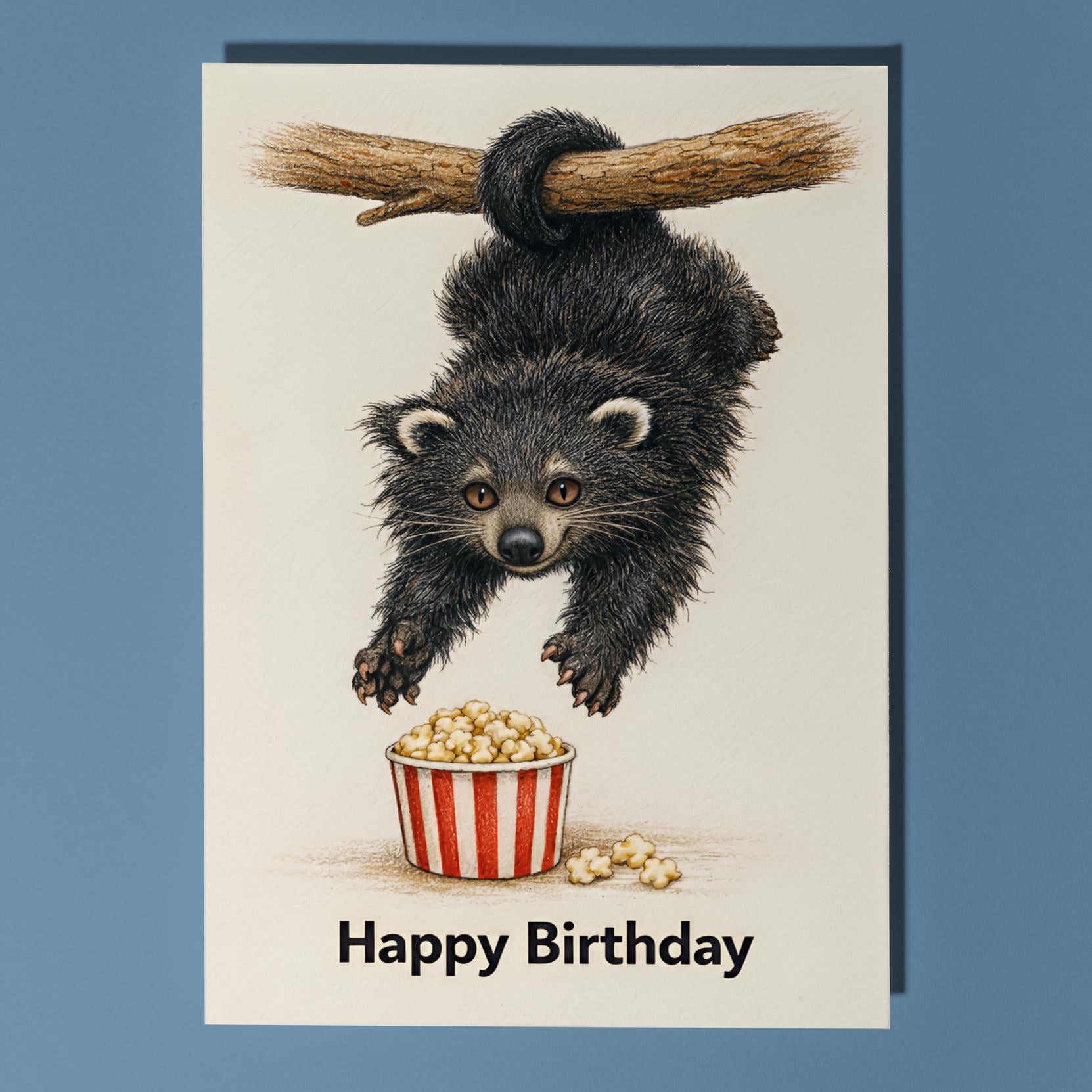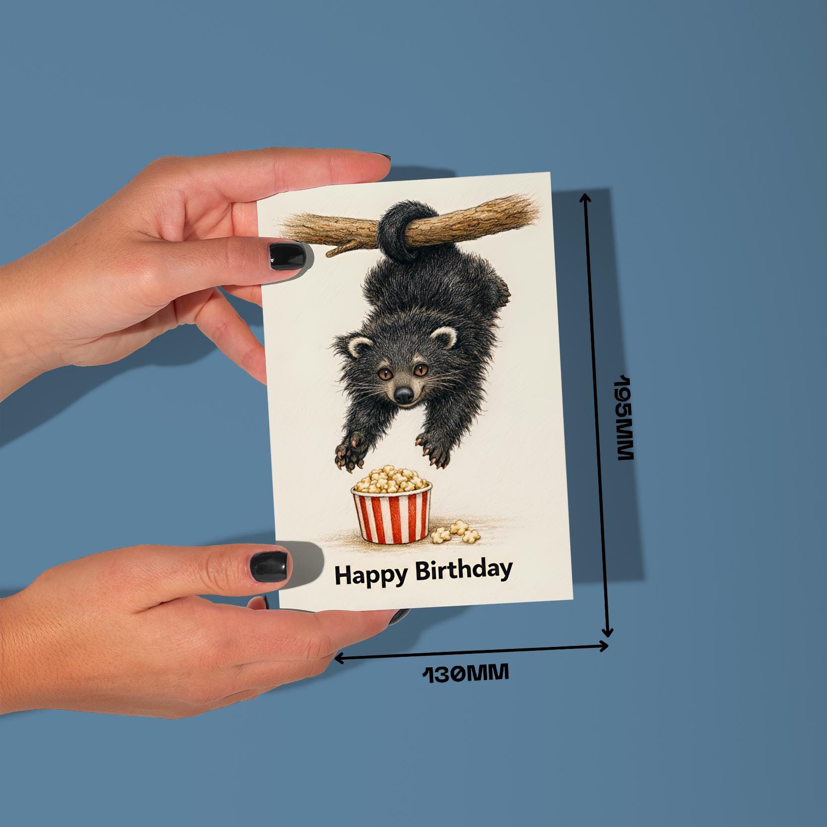 BLANK INTERIOR FOR A PERSONAL TOUCH: Our Animal Hugs Collection Popcorn Bearcat Buddy – (Binturong) - Happy Birthday! card - Native to the forests of Southeast Asia, the bearcat (binturong) is famous for its natural popcorn-like scent, making this cosy scene even more special.