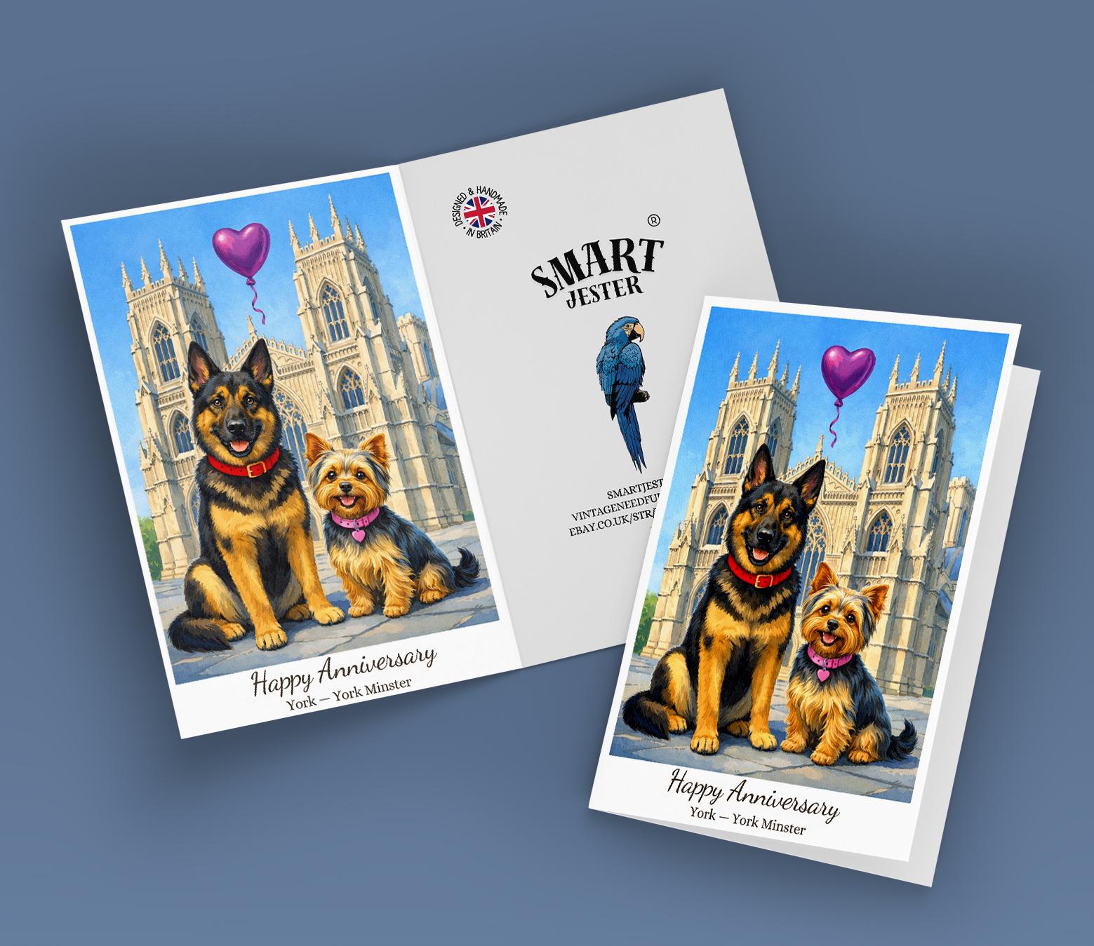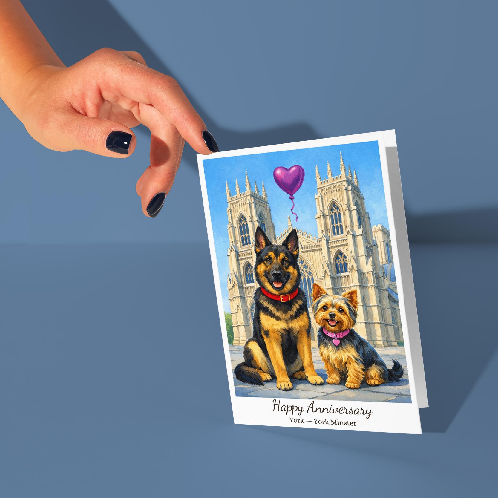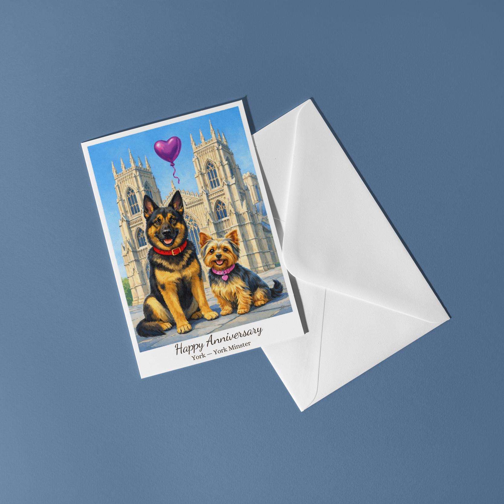BLANK INTERIOR FOR A PERSONAL TOUCH: Our Paws & Places Collection - York - York Minster The Shambles - Yorkshire Terrier and German Shepherd Dogs Happy Anniversary Card and other whimsical designs feature a blank interior, giving you ample space to write a personal message from the heart. Perfect for any occasion, each card comes with a matching white envelope, making it easy to send your unique sentiments to loved ones.