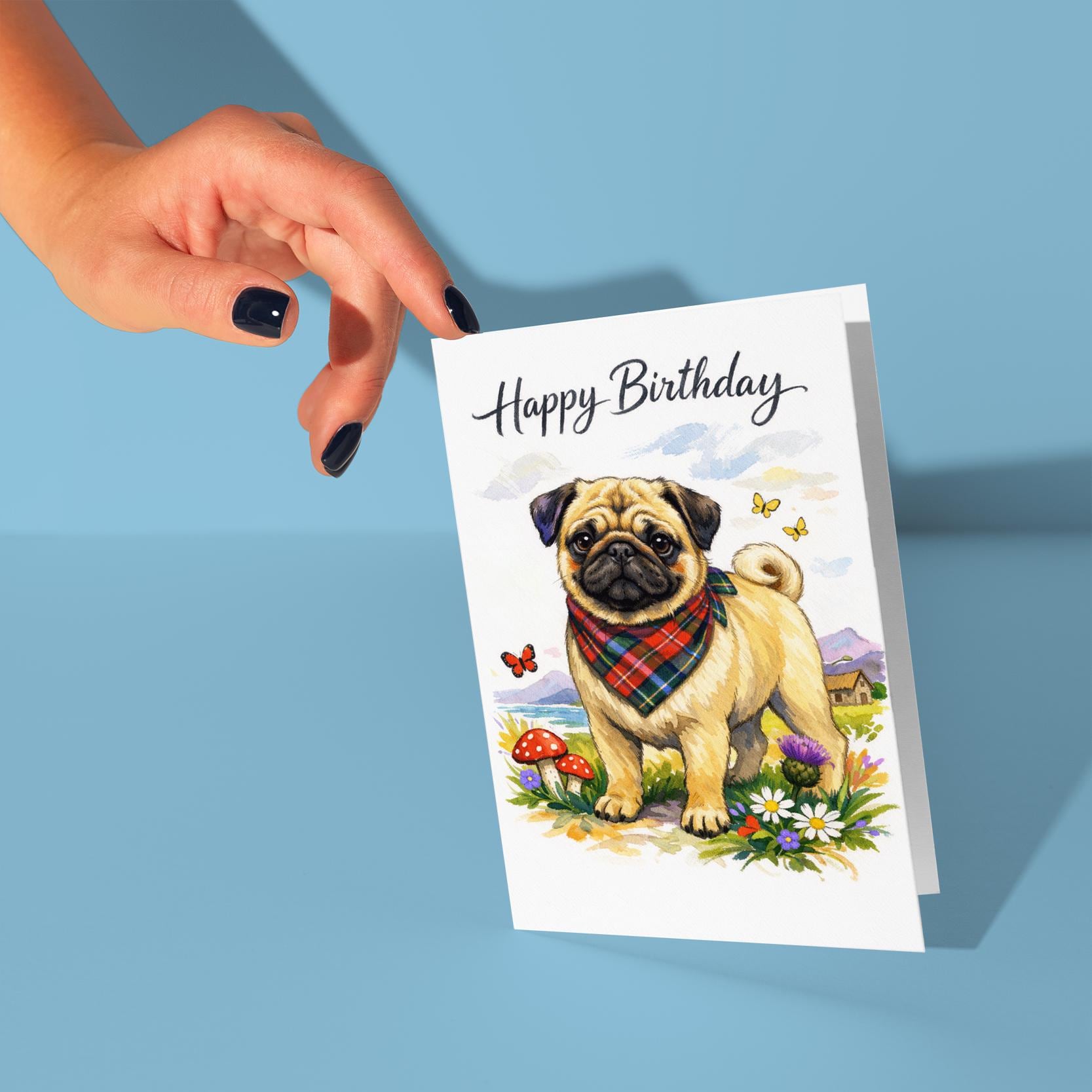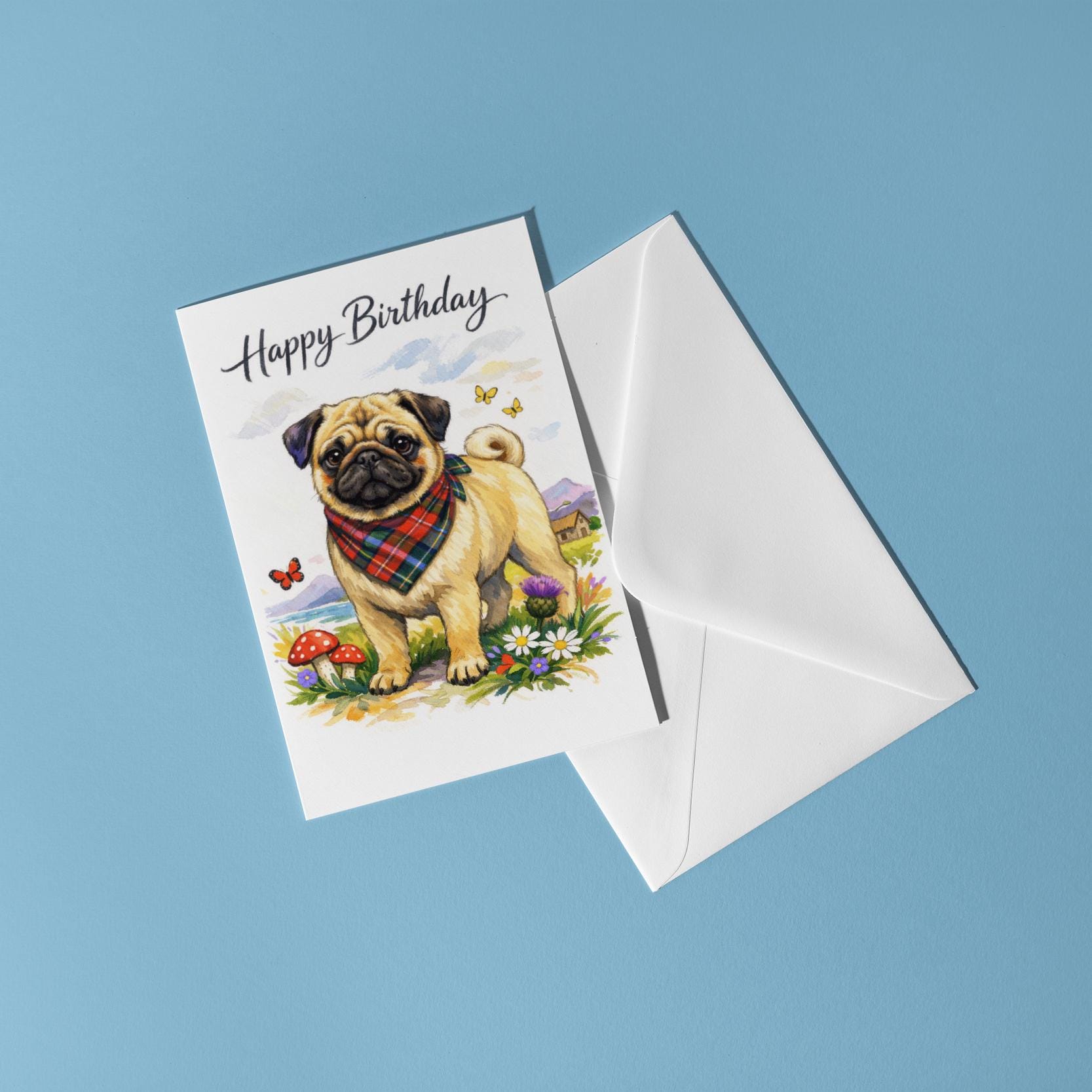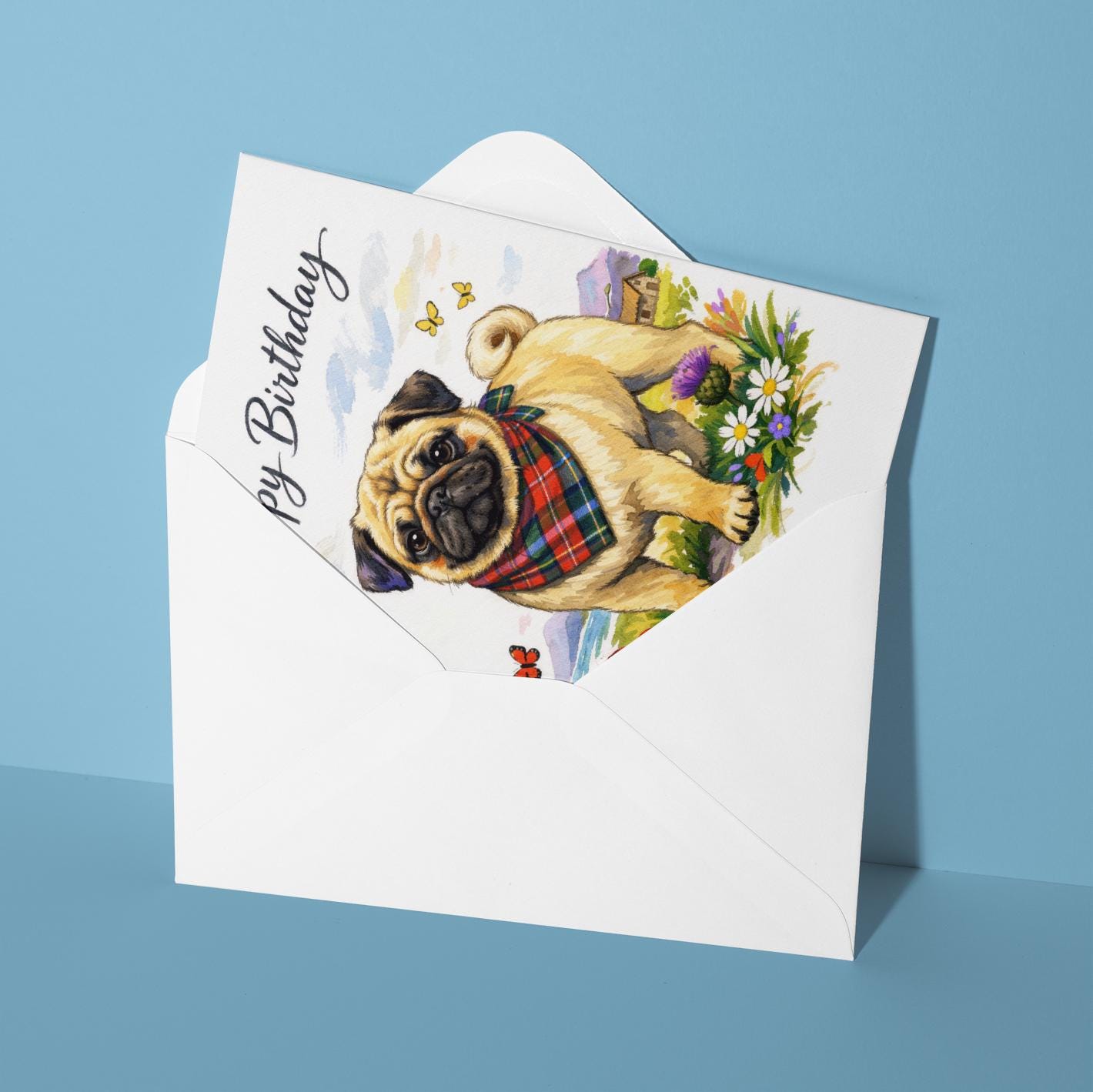 BLANK INTERIOR FOR A PERSONAL TOUCH: Our Dog Breeds Collection - Scottish Pug: Thistle Friend Happy Birthday! card and other whimsical designs feature a blank interior, giving you ample space to write a personal message from the heart. Perfect for any occasion, each card comes with a matching white envelope, making it easy to send your unique sentiments to loved ones.