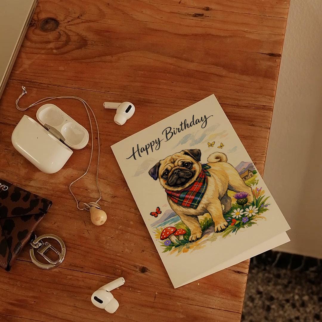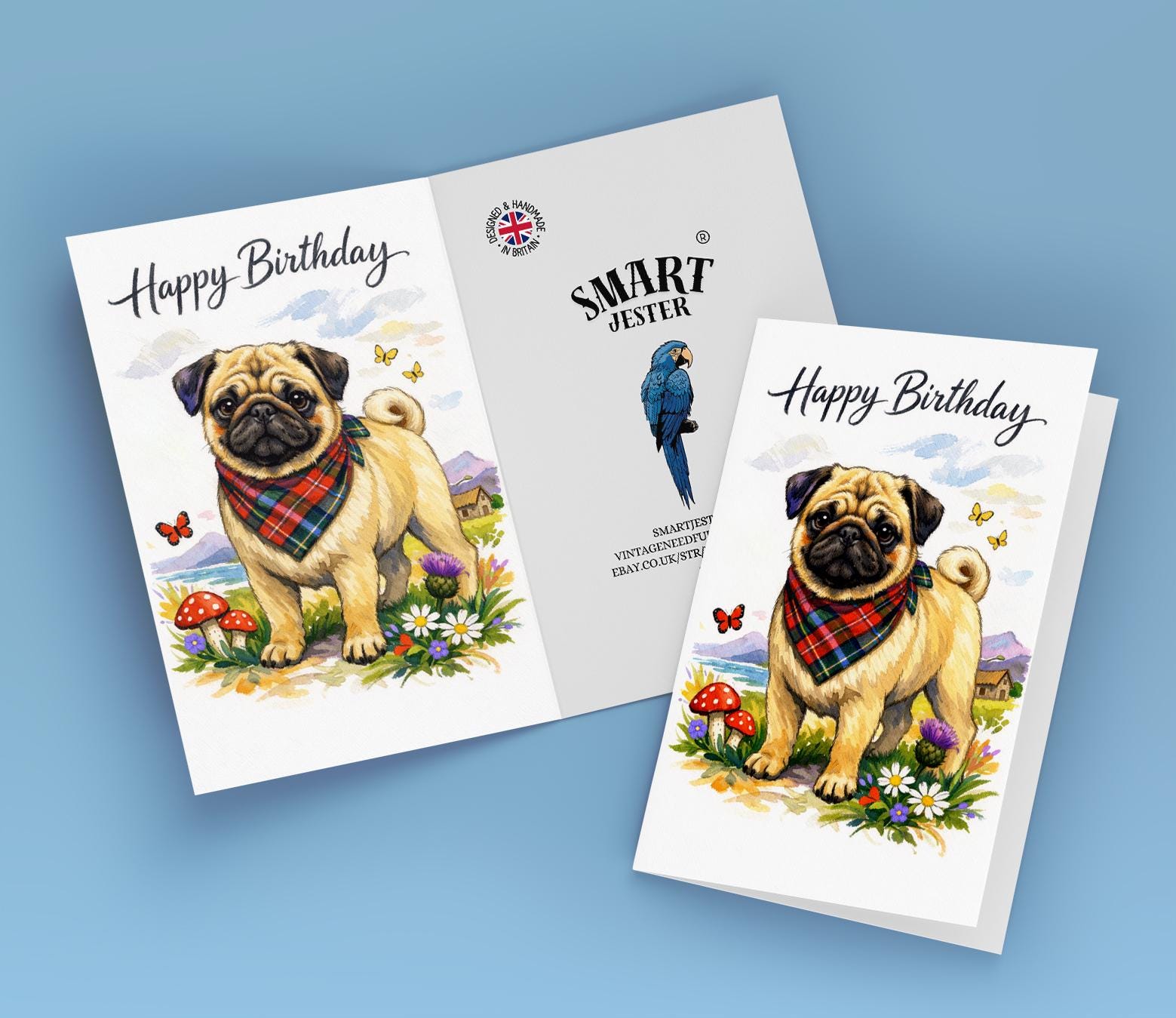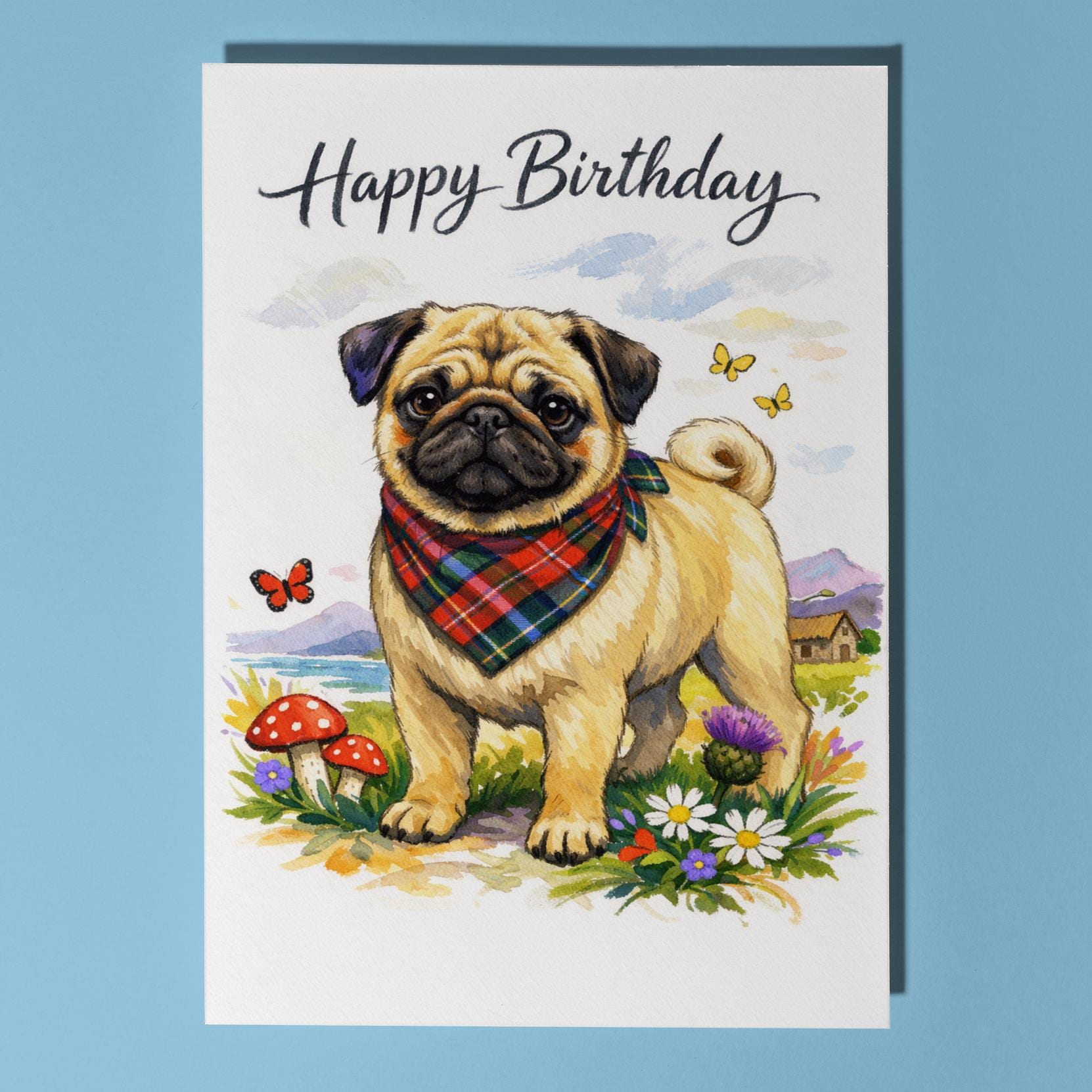 BLANK INTERIOR FOR A PERSONAL TOUCH: Our Dog Breeds Collection - Scottish Pug: Thistle Friend Happy Birthday! card and other whimsical designs feature a blank interior, giving you ample space to write a personal message from the heart. Perfect for any occasion, each card comes with a matching white envelope, making it easy to send your unique sentiments to loved ones.