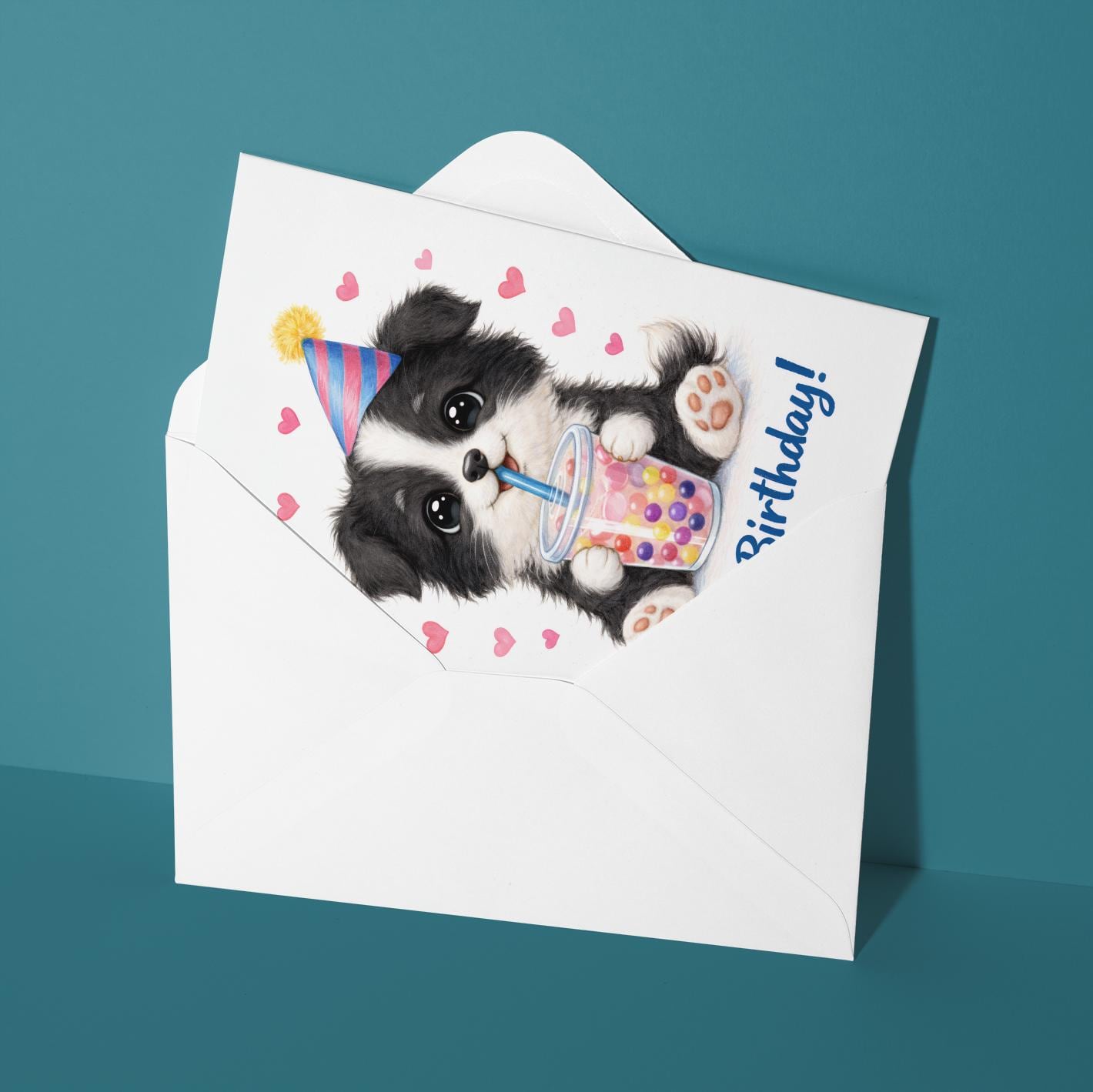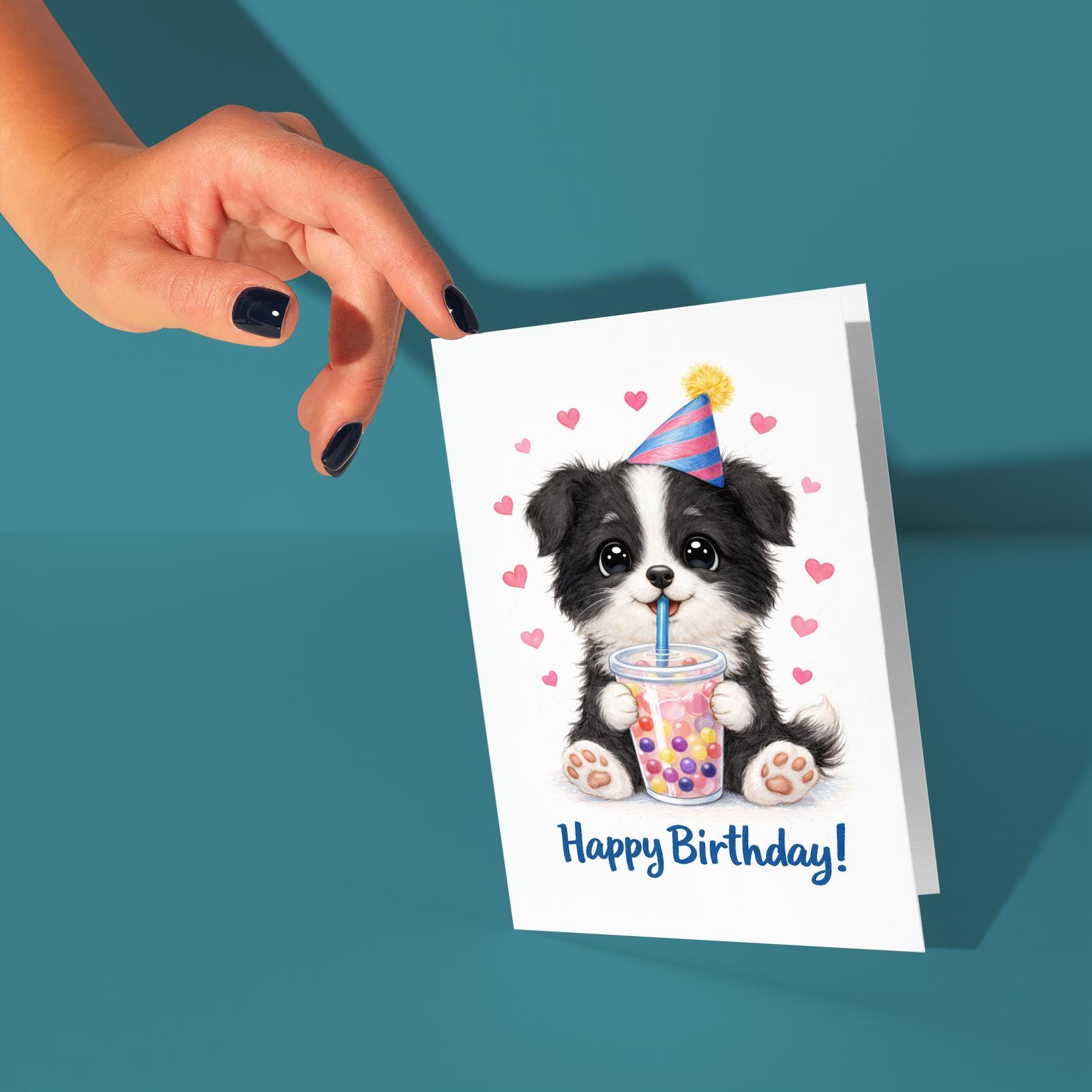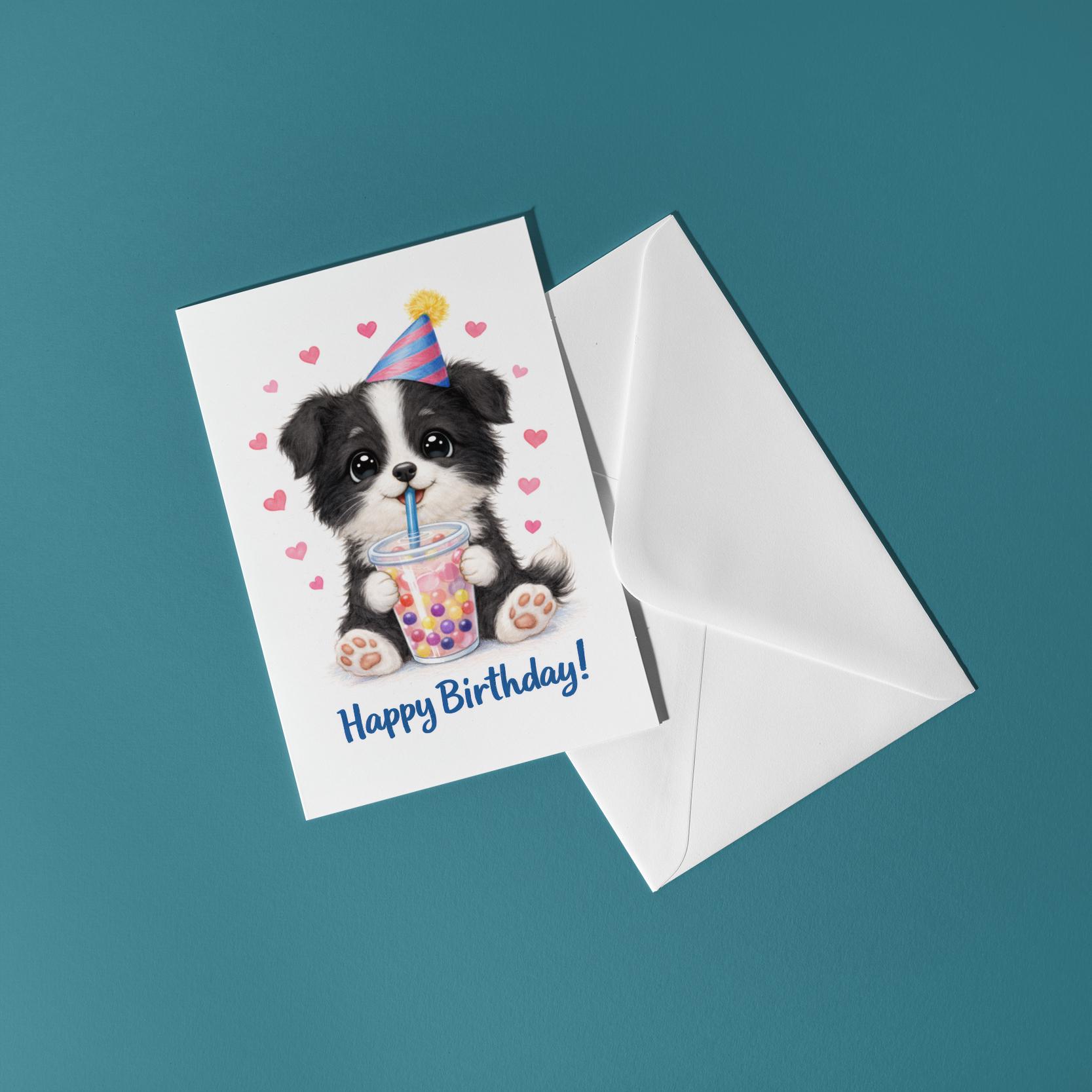 BLANK INTERIOR FOR A PERSONAL TOUCH: Our Kawaii Art Series - Border Collie puppy: Sweet Boba Sip Bubble Tea - Happy Birthday! card and other whimsical designs feature a blank interior, giving you ample space to write a personal message from the heart. Perfect for any occasion, each card comes with a matching white envelope, making it easy to send your unique sentiments to loved ones.