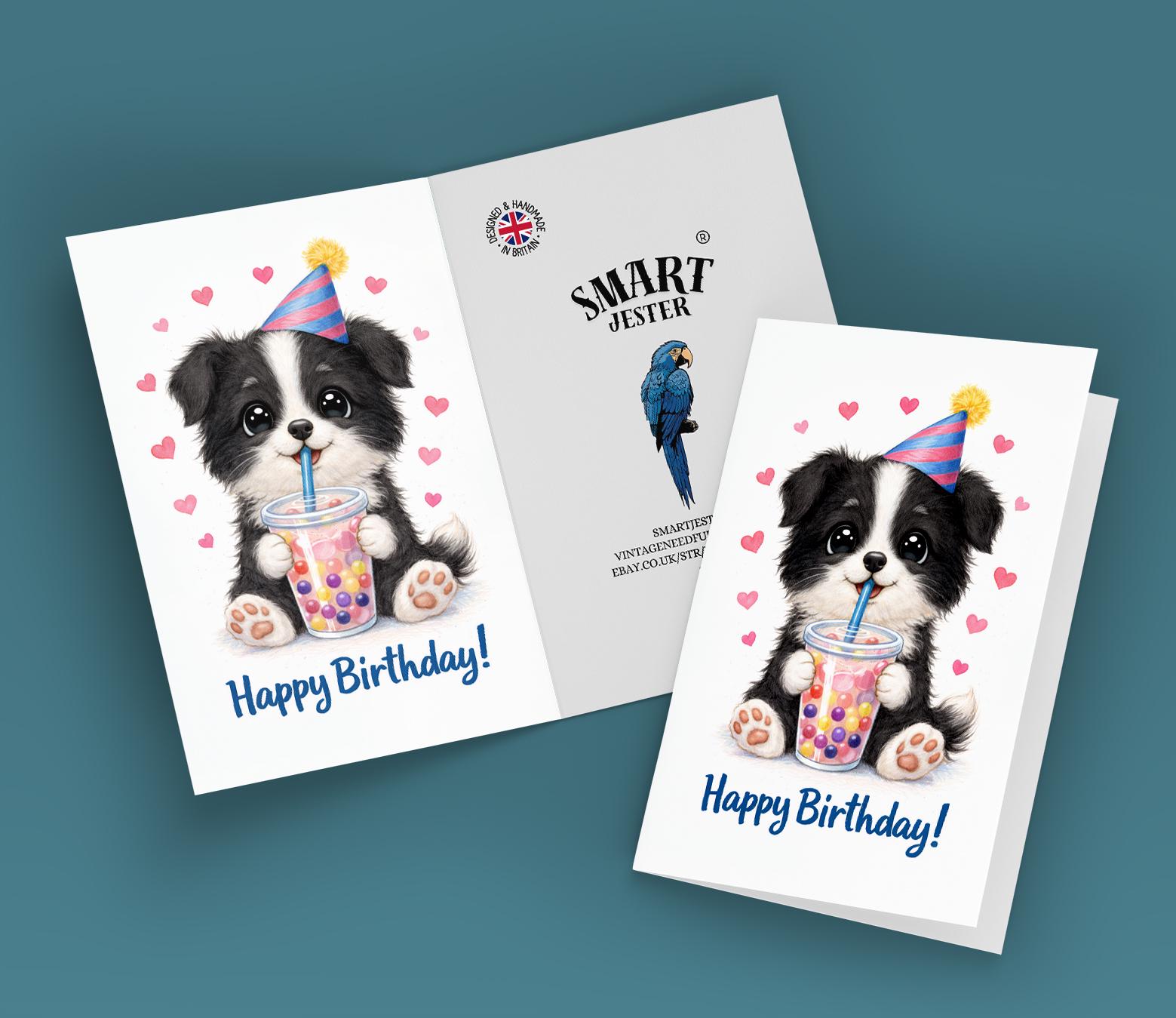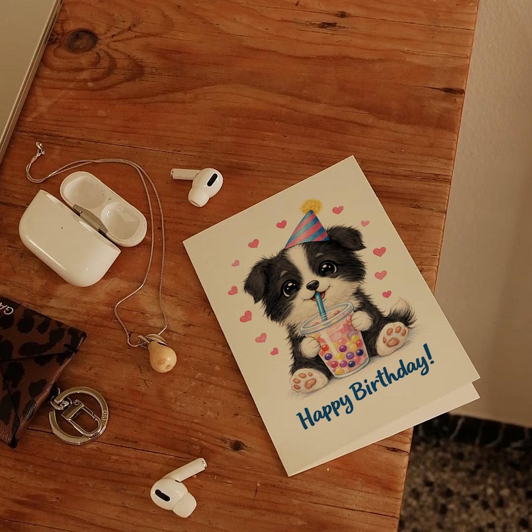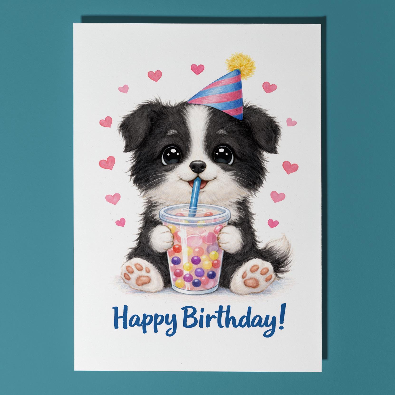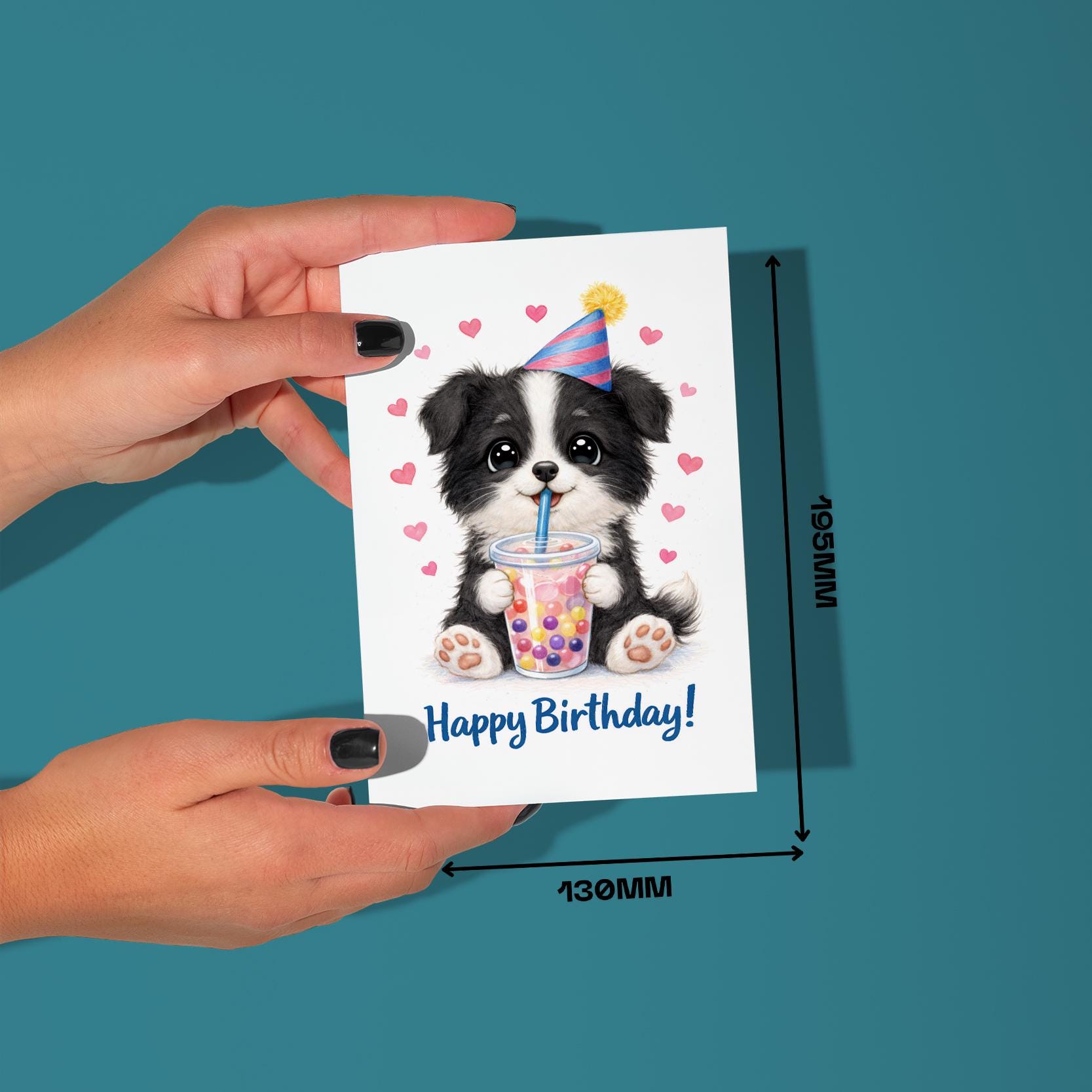 BLANK INTERIOR FOR A PERSONAL TOUCH: Our Kawaii Art Series - Border Collie puppy: Sweet Boba Sip Bubble Tea - Happy Birthday! card and other whimsical designs feature a blank interior, giving you ample space to write a personal message from the heart. Perfect for any occasion, each card comes with a matching white envelope, making it easy to send your unique sentiments to loved ones.