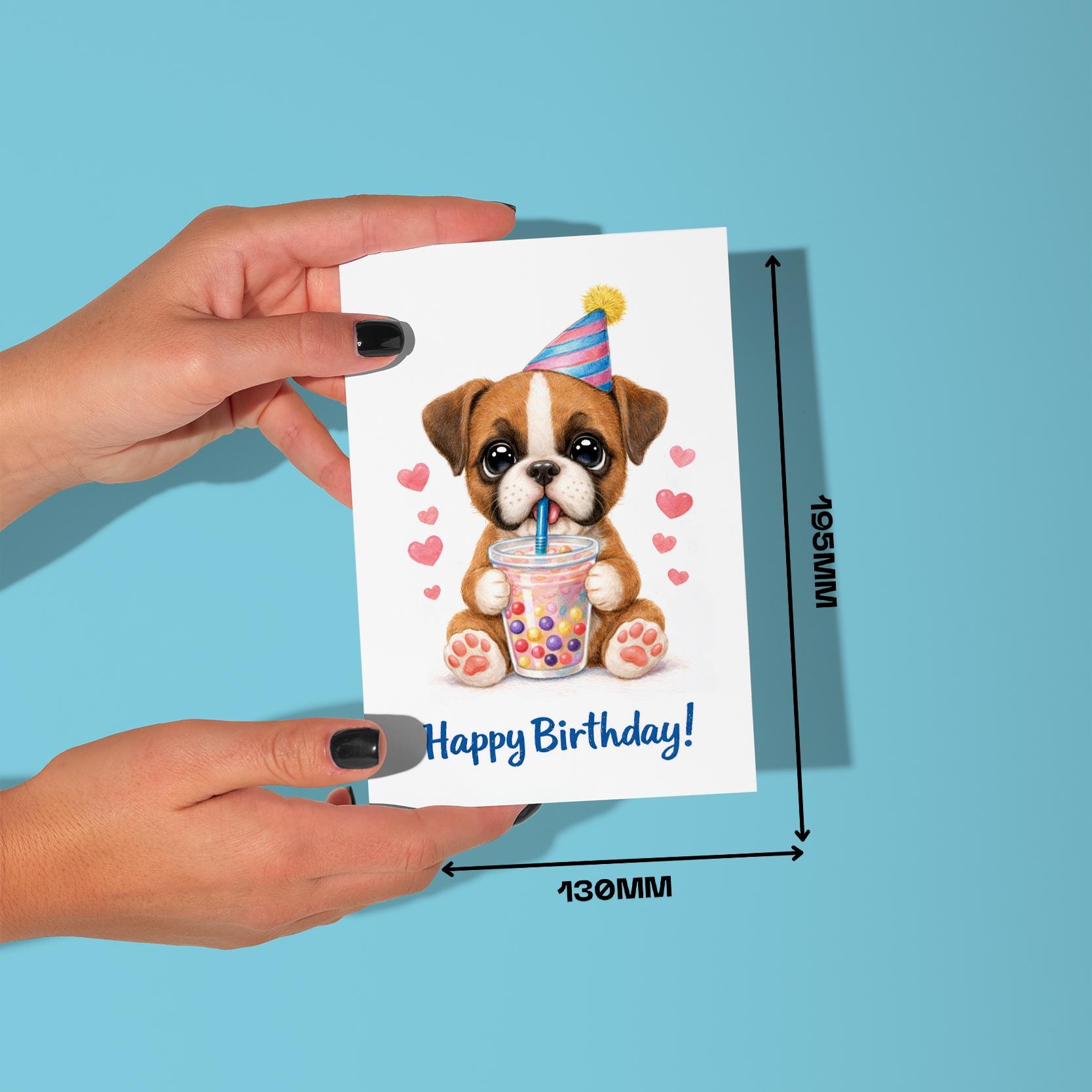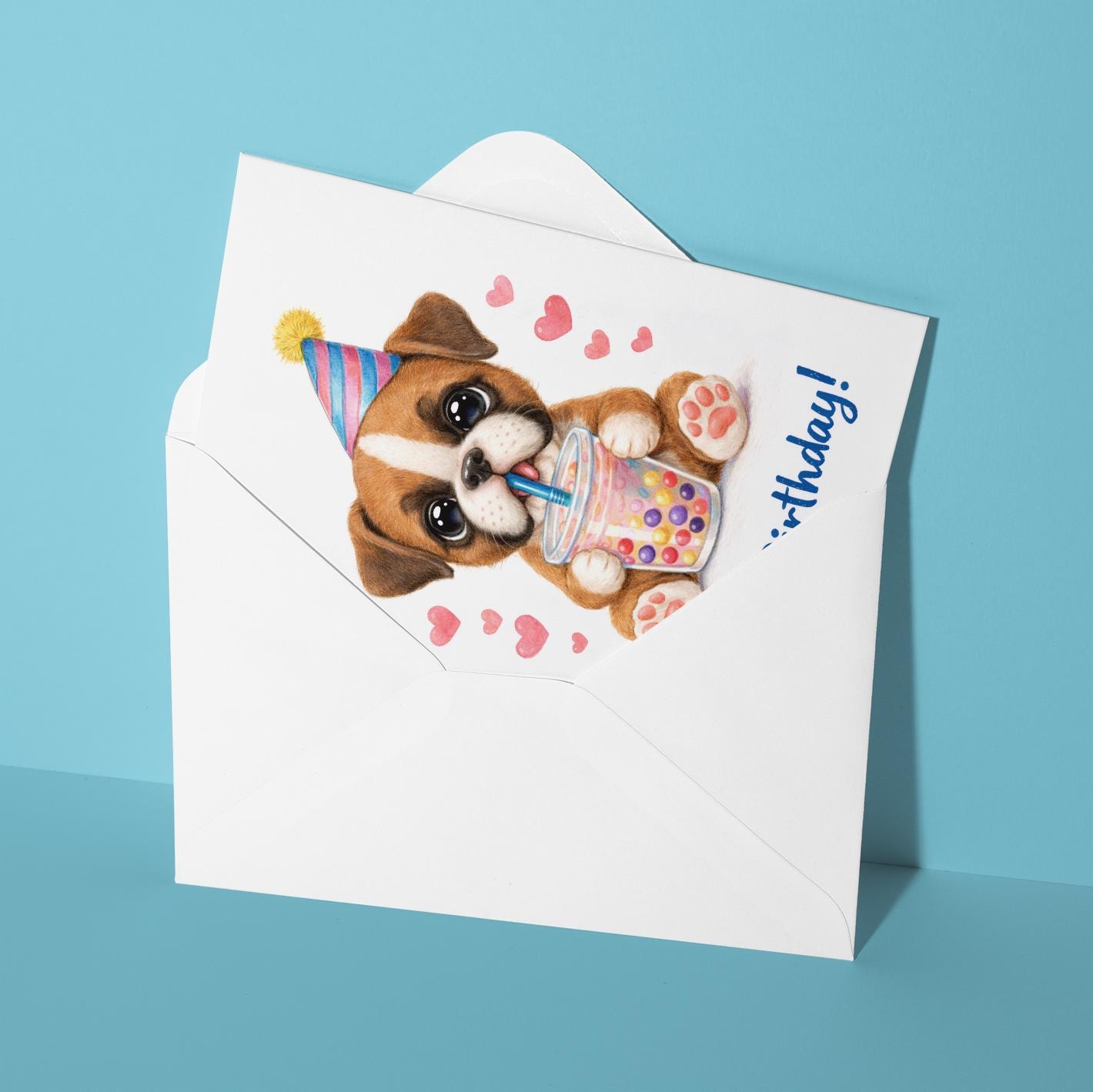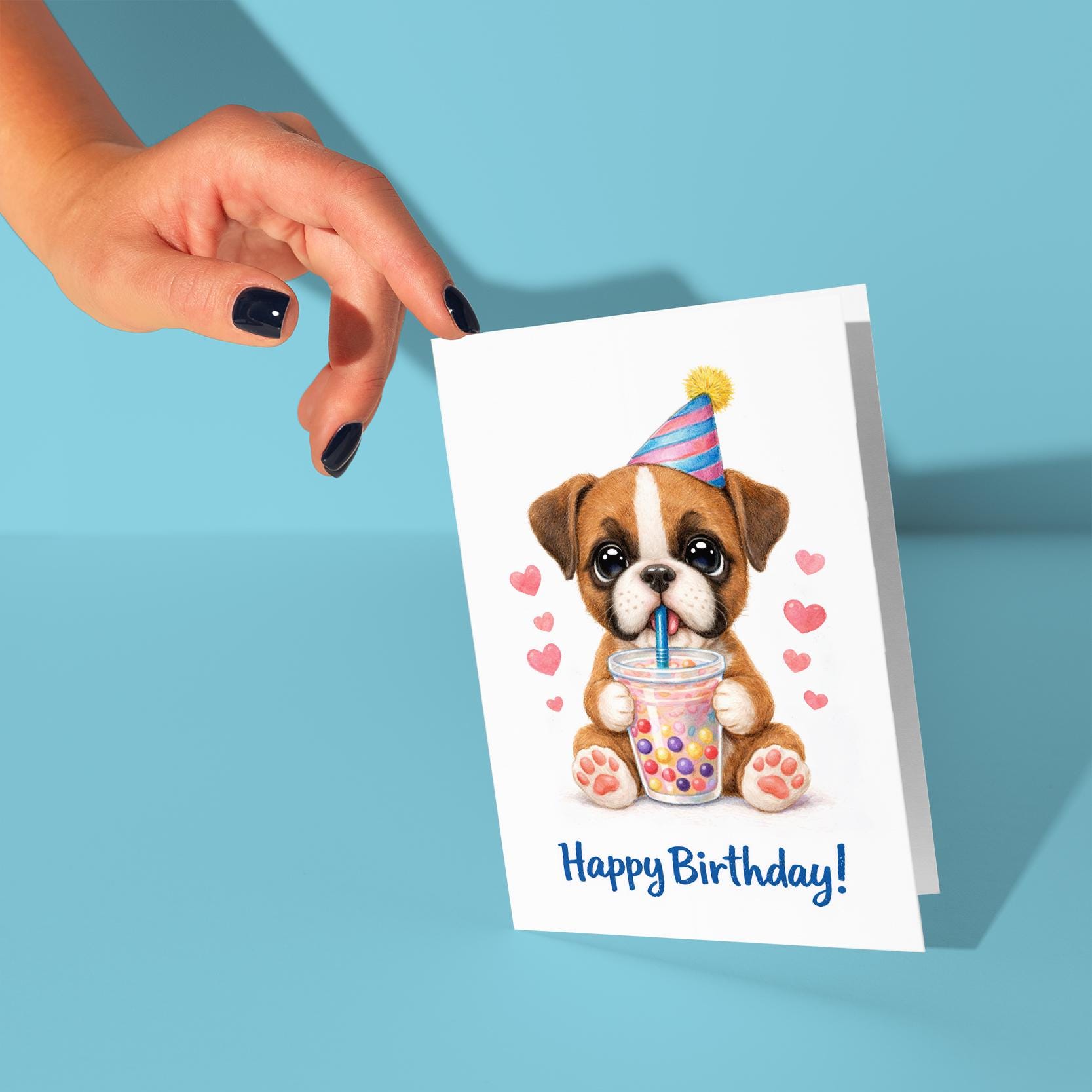 BLANK INTERIOR FOR A PERSONAL TOUCH: Our Kawaii Art Series - Boxer puppy: puppy: Sweet Boba Sip Bubble Tea - Happy Birthday! card and other whimsical designs feature a blank interior, giving you ample space to write a personal message from the heart. Perfect for any occasion, each card comes with a matching white envelope, making it easy to send your unique sentiments to loved ones.