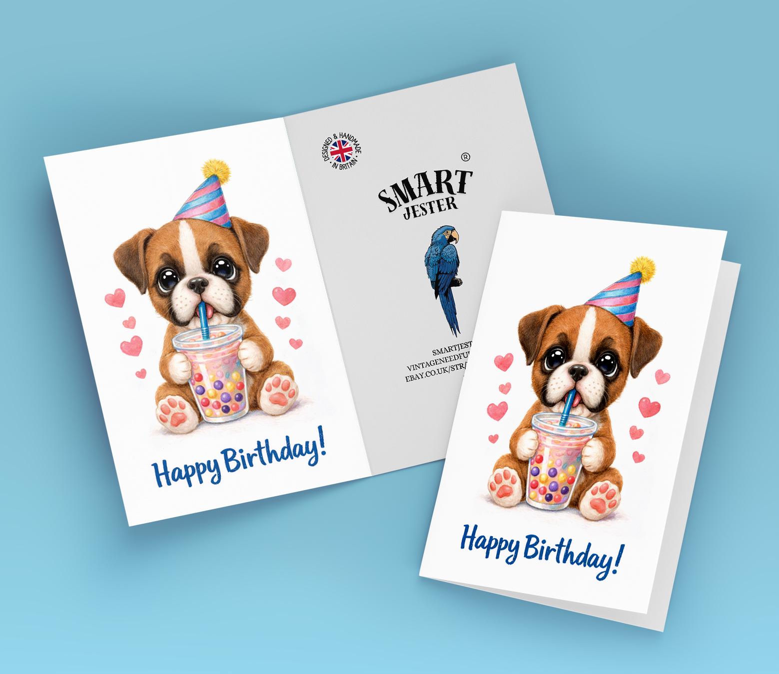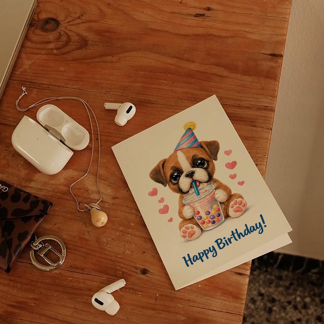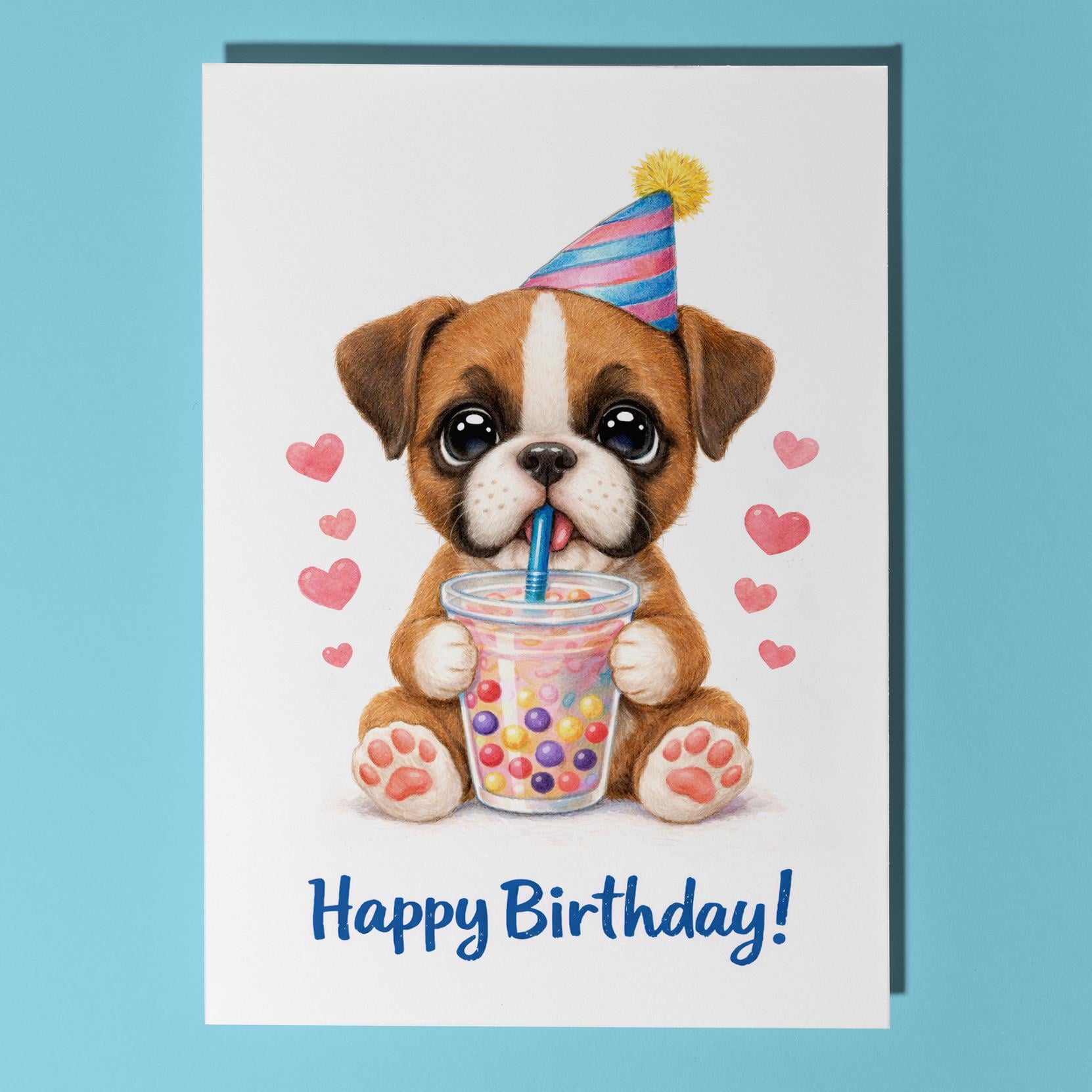 BLANK INTERIOR FOR A PERSONAL TOUCH: Our Kawaii Art Series - Boxer puppy: puppy: Sweet Boba Sip Bubble Tea - Happy Birthday! card and other whimsical designs feature a blank interior, giving you ample space to write a personal message from the heart. Perfect for any occasion, each card comes with a matching white envelope, making it easy to send your unique sentiments to loved ones.