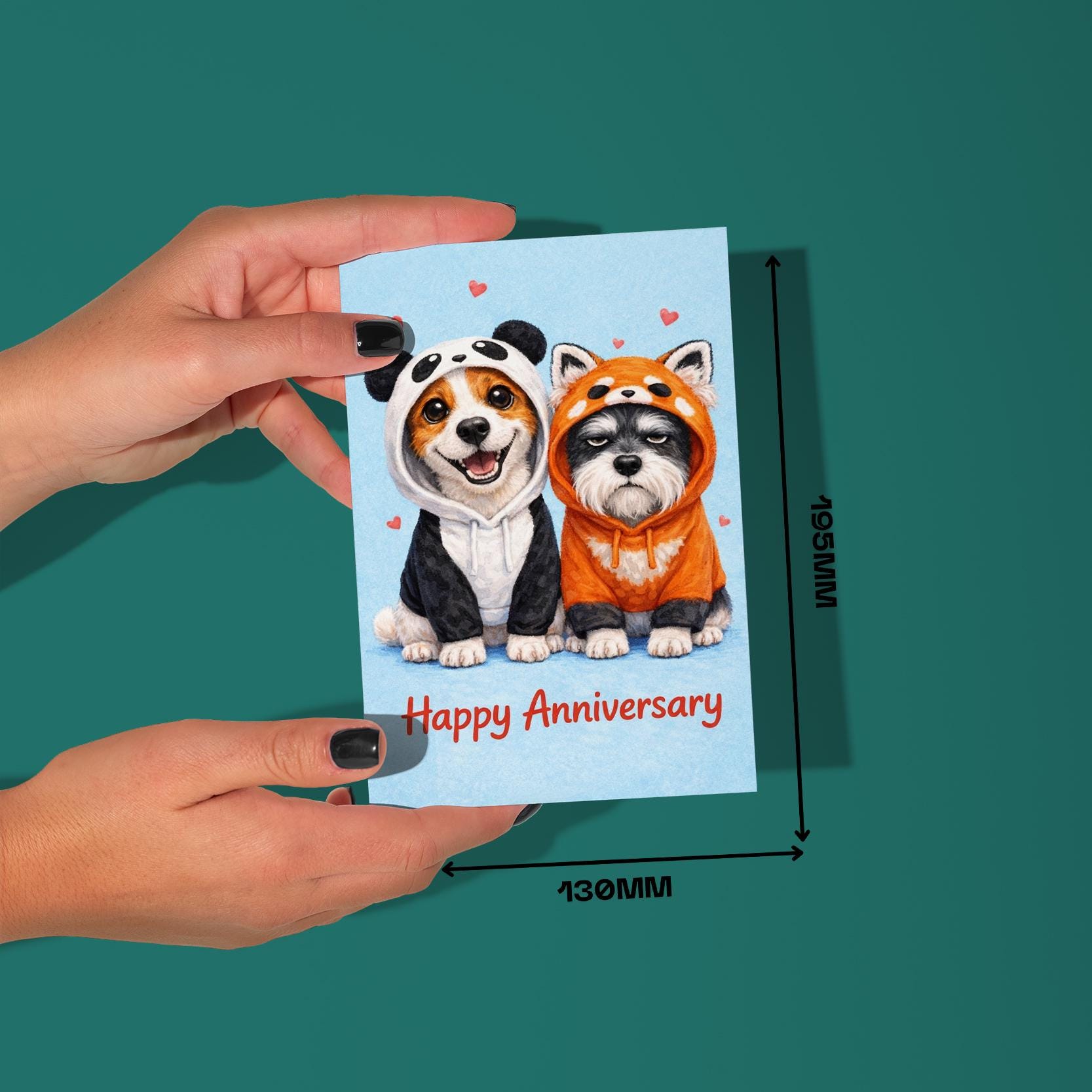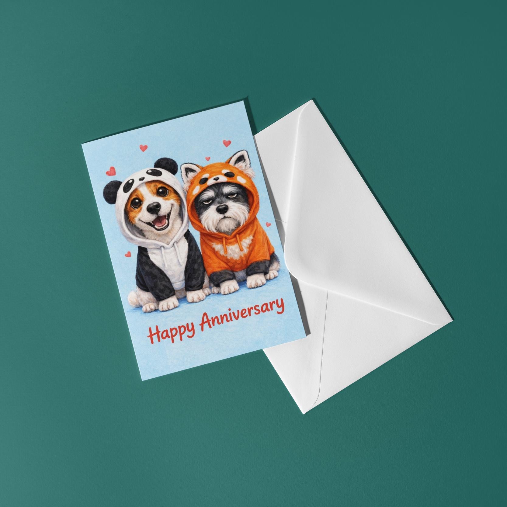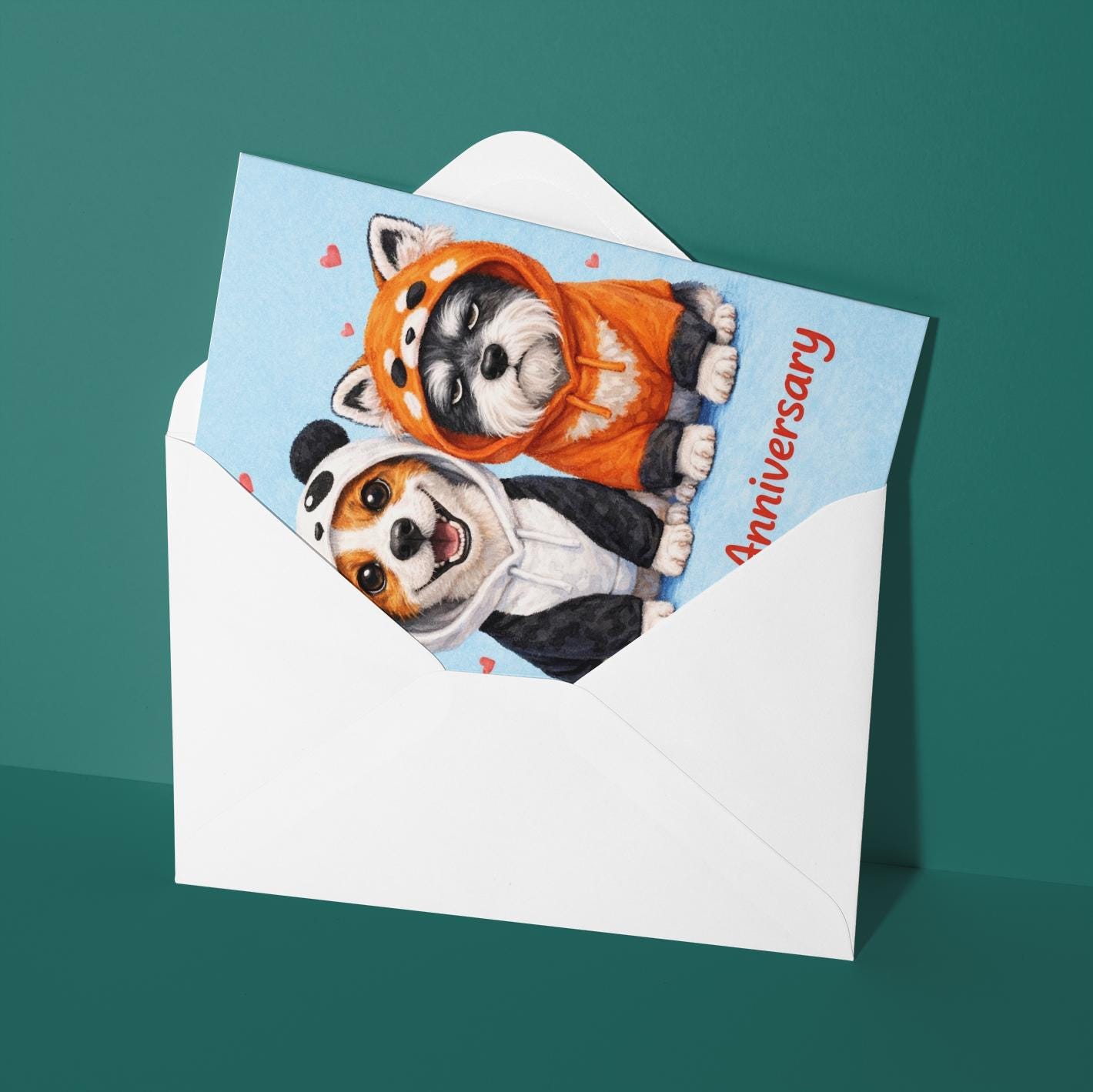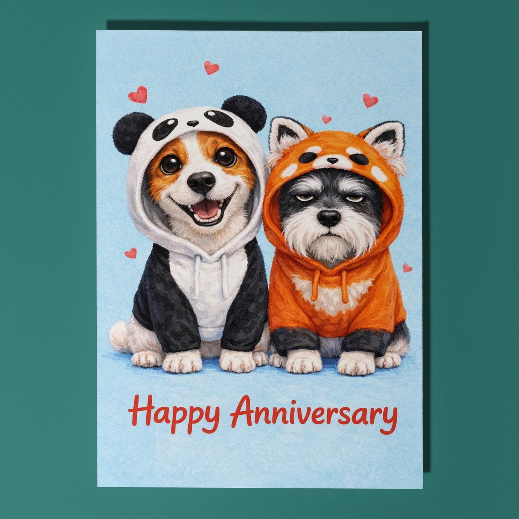 BLANK INTERIOR FOR A PERSONAL TOUCH: Our Dog Breeds Collection - Jack Russell Terrier and Schnauzer dogs in Panda Red Panda hoodie - Happy Anniversary Card and other whimsical designs feature a blank interior, giving you ample space to write a personal message from the heart. Perfect for any occasion, each card comes with a matching white envelope, making it easy to send your unique sentiments to loved ones.