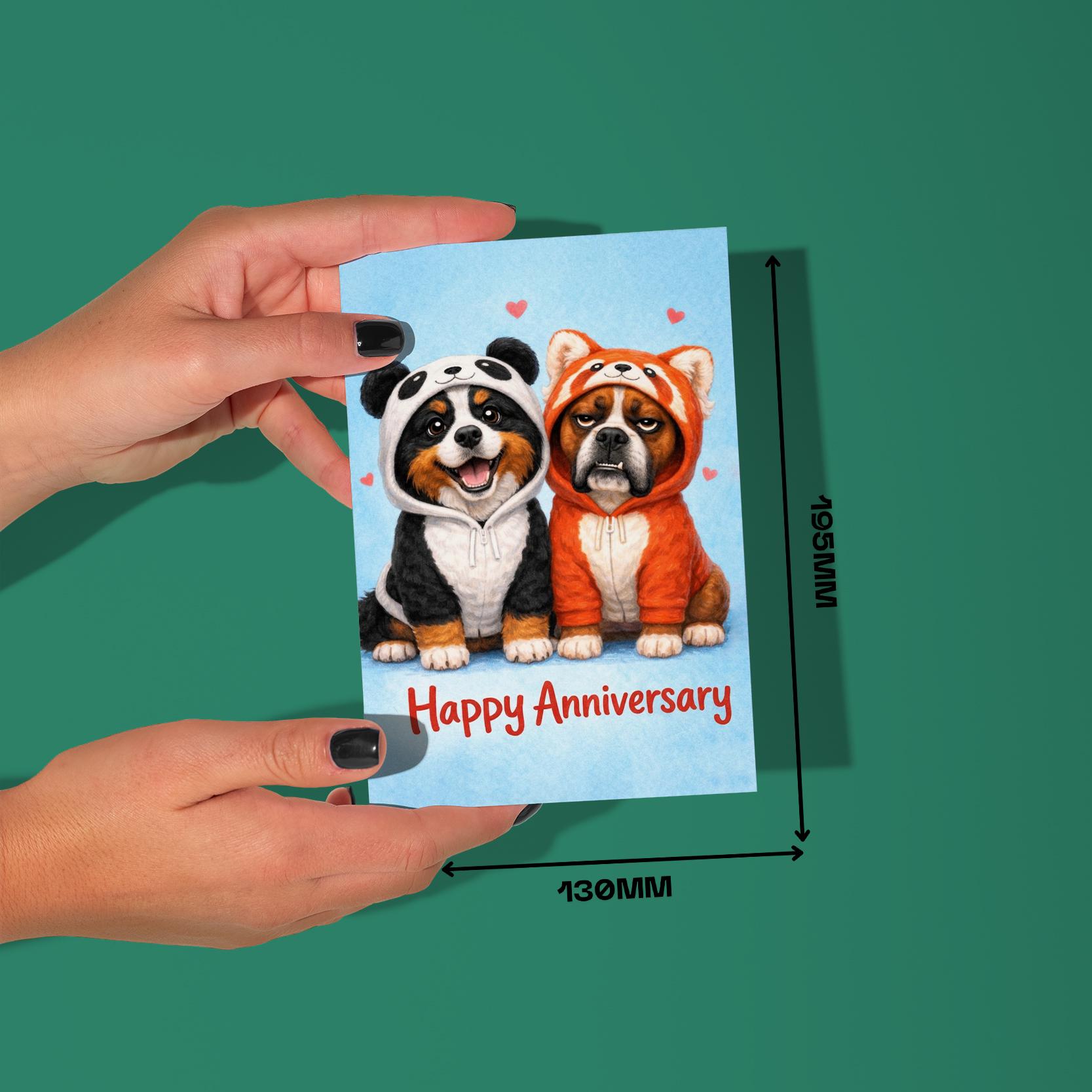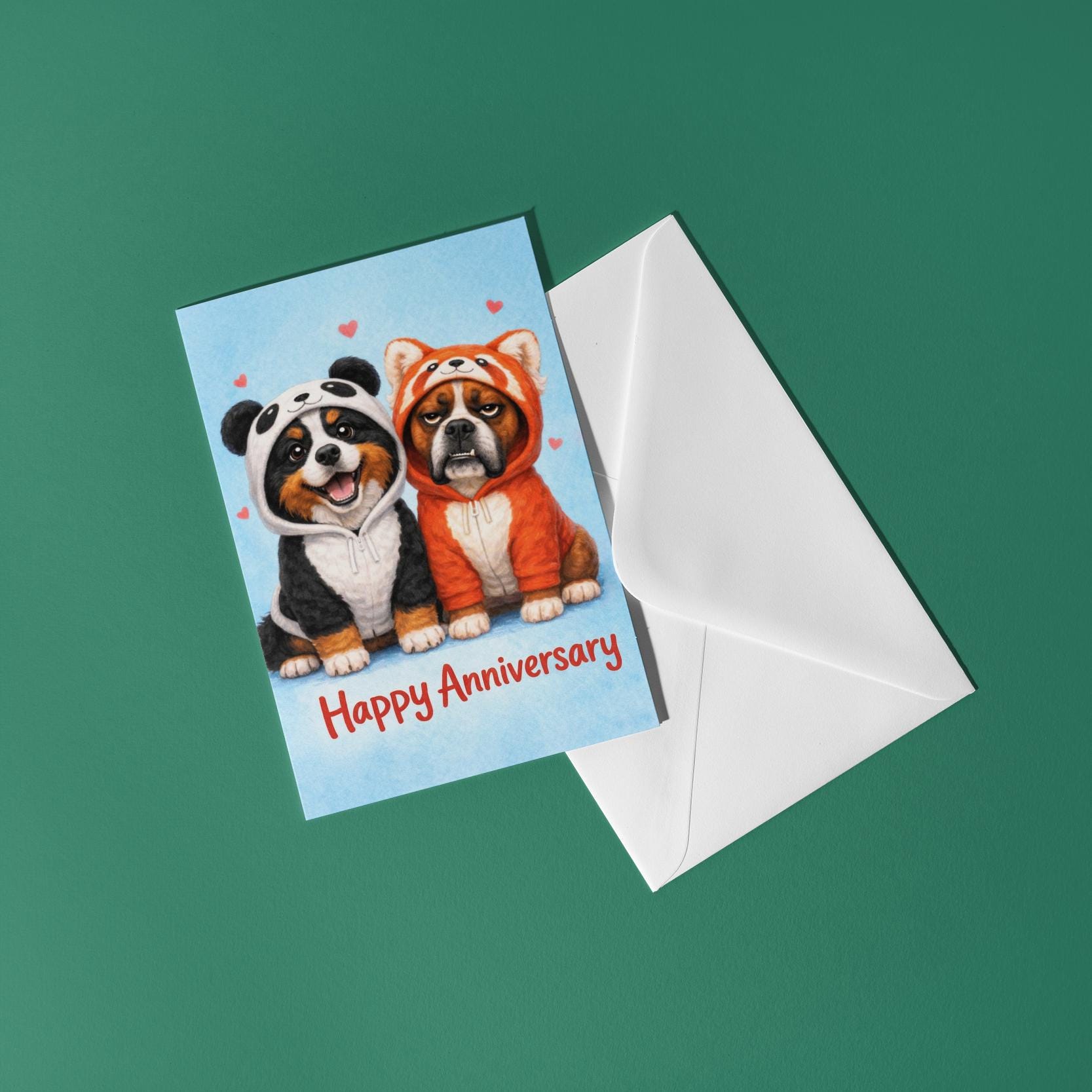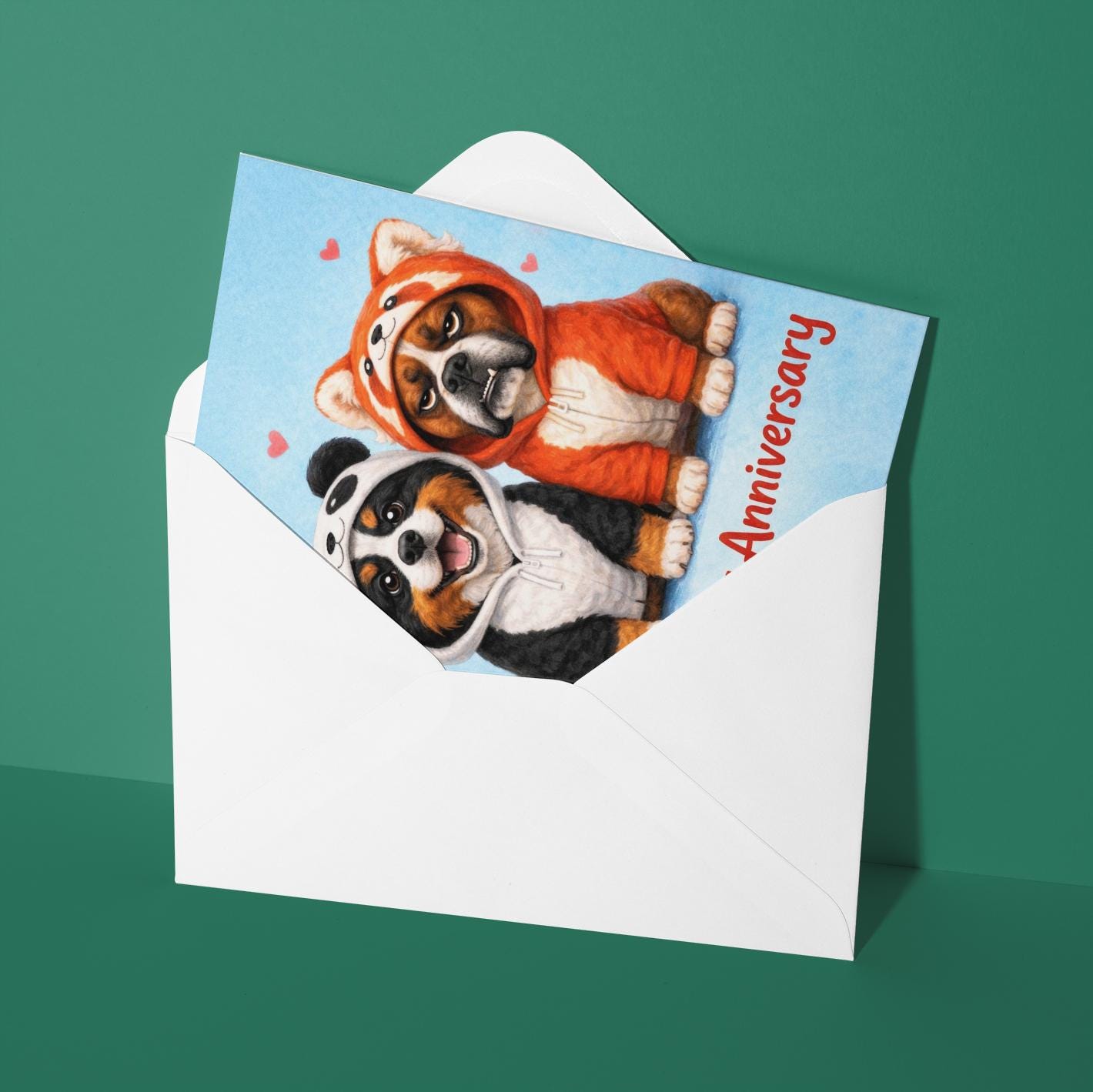 BLANK INTERIOR FOR A PERSONAL TOUCH: Our Dog Breeds Collection - Bernese Mountain Dog Boxer Dog in Panda Red Panda hoodie - Happy Anniversary Card and other whimsical designs feature a blank interior, giving you ample space to write a personal message from the heart. Perfect for any occasion, each card comes with a matching white envelope, making it easy to send your unique sentiments to loved ones.