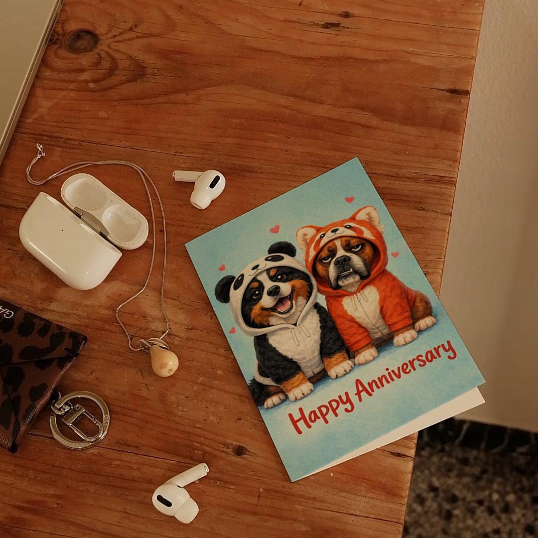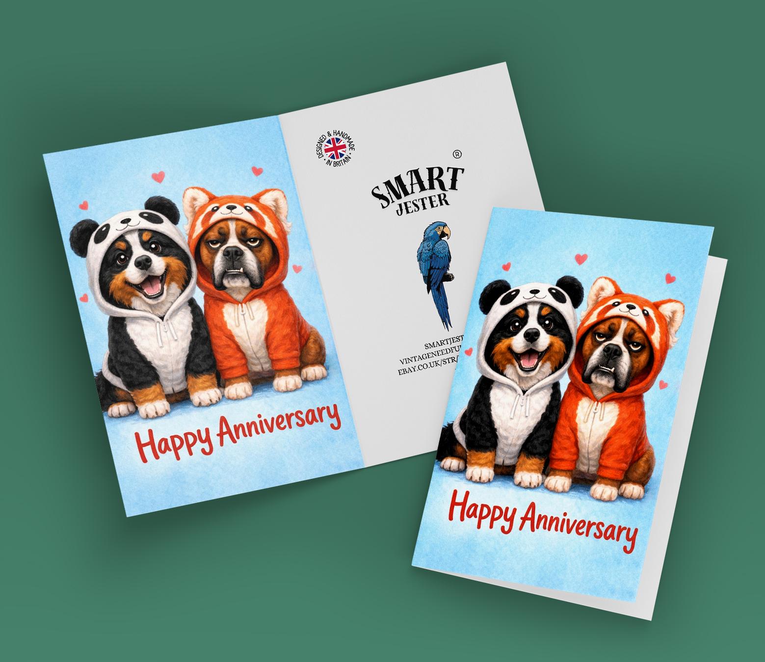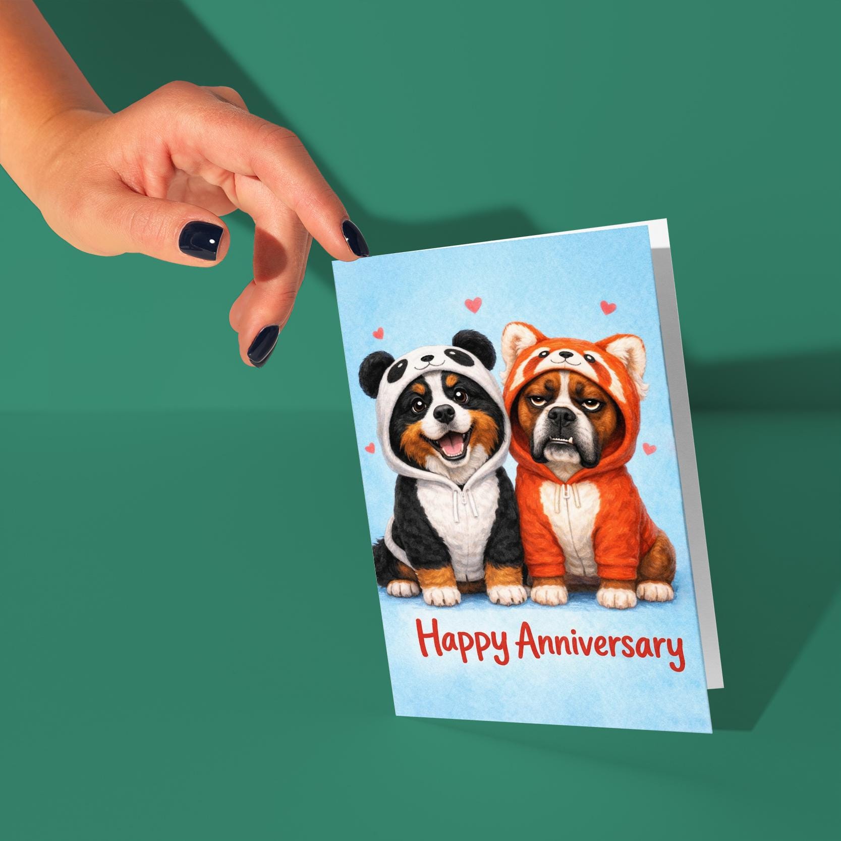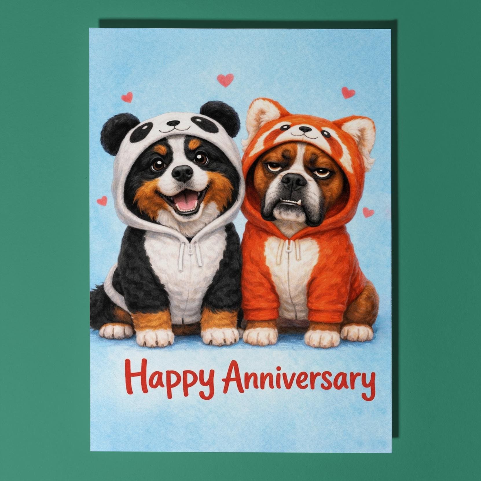 BLANK INTERIOR FOR A PERSONAL TOUCH: Our Dog Breeds Collection - Bernese Mountain Dog Boxer Dog in Panda Red Panda hoodie - Happy Anniversary Card and other whimsical designs feature a blank interior, giving you ample space to write a personal message from the heart. Perfect for any occasion, each card comes with a matching white envelope, making it easy to send your unique sentiments to loved ones.