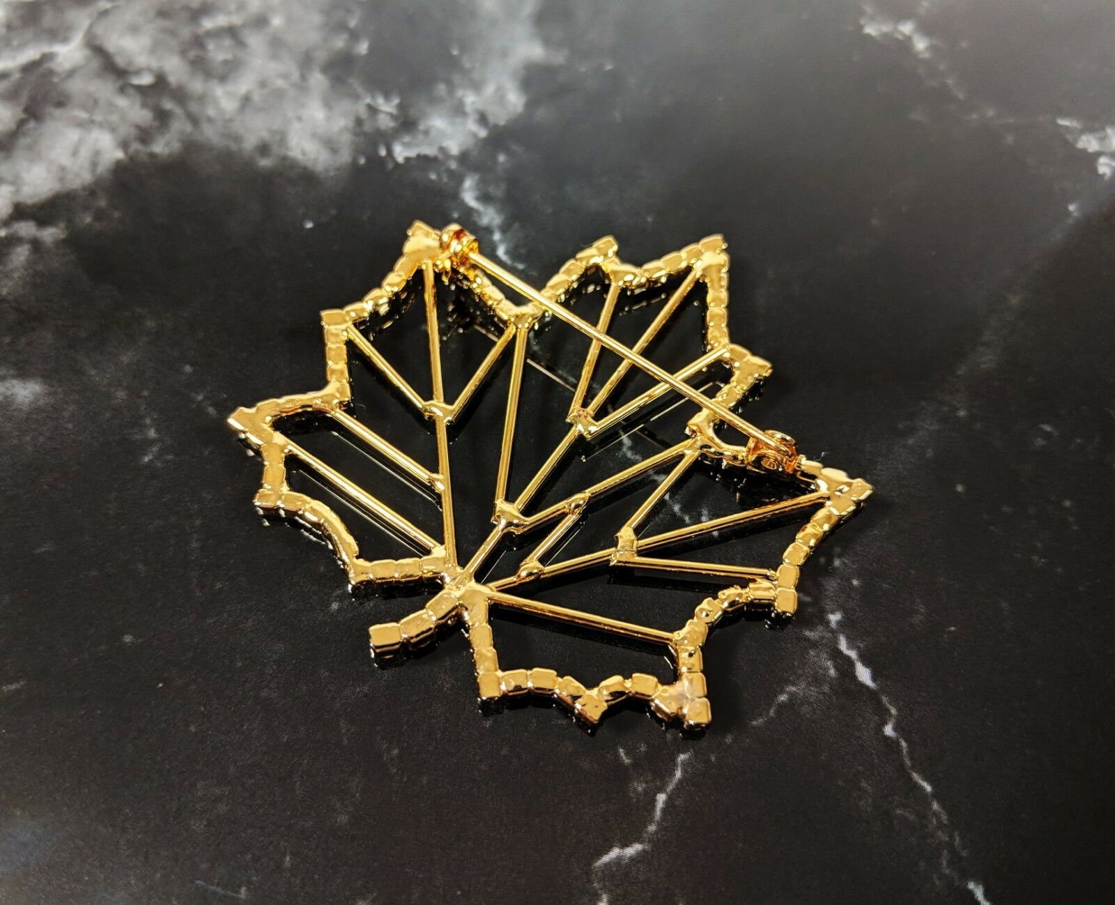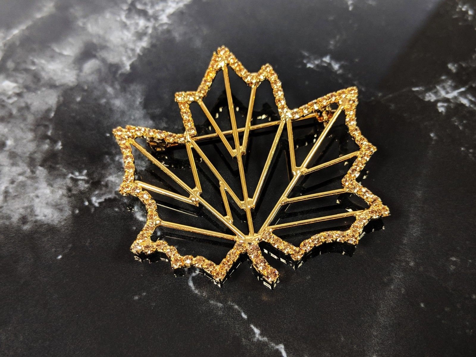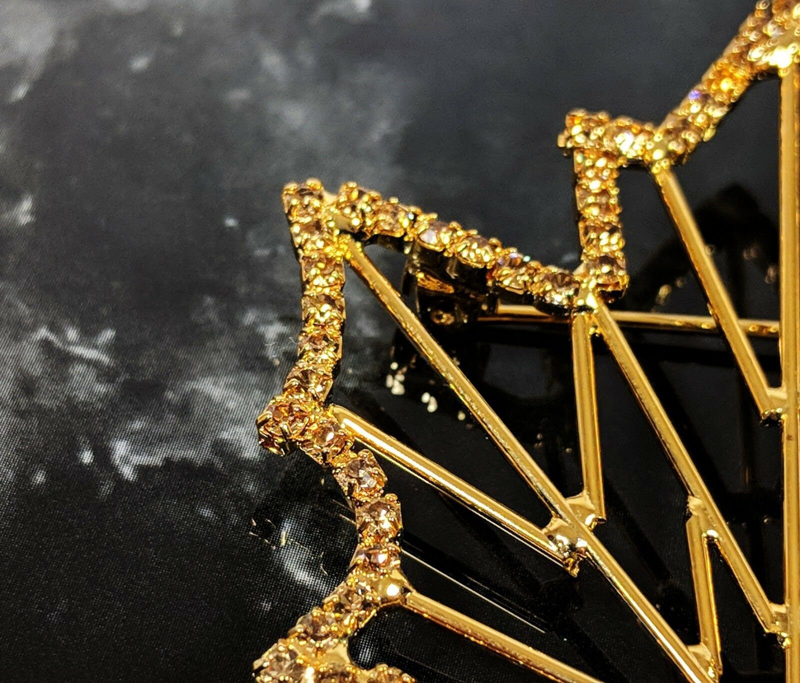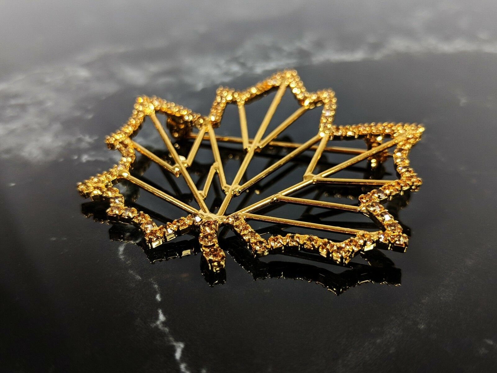 An unsigned but substantial brooch is offered for your consideration. Gorgeous, gleaming goldtone, this beauty is fashioned in a leaf design using faux pave diamonds which are set in an antique, lightly hammered gold-tone setting. The back has the same openwork design as the front as well as a smooth gold section which holds the roll-over closure. It measures 2 inches by 2 inches and is in absolutely mint condition. This brooch is a masterpiece! Also, this brooch looks very expensive, like real gold.